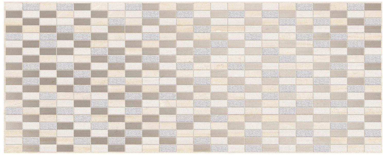 Бежевый декор Beryoza Ceramica Элиз представлен в виде рельефного полотна с выдавленными прямоугольными фигурками разных цветов: коричневого, бежевого, серого.