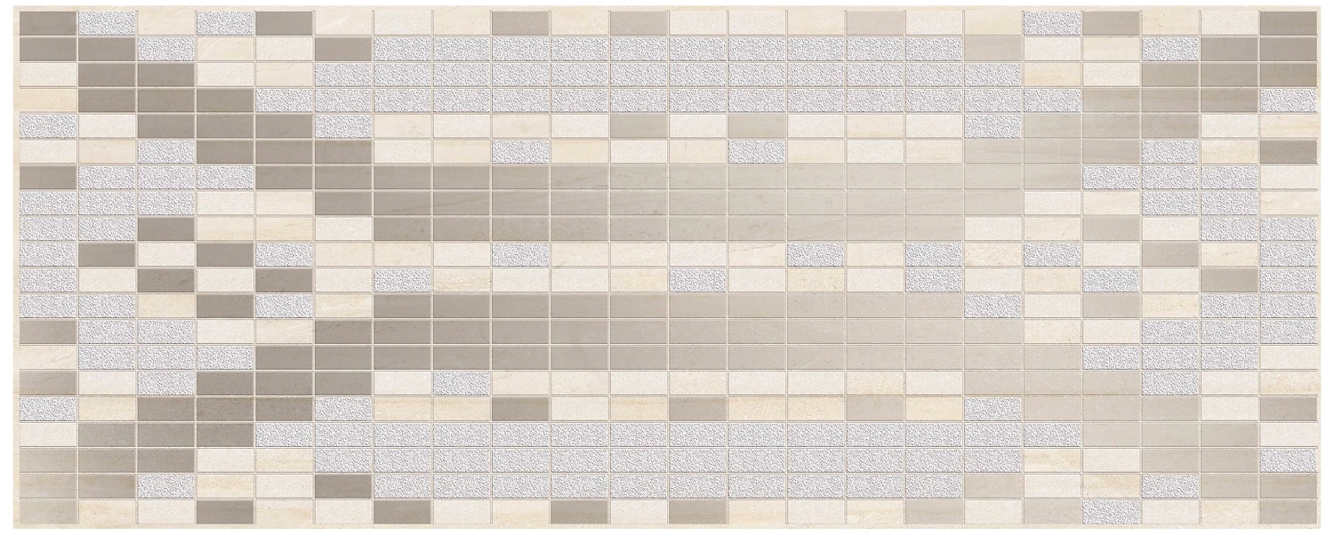 Бежевый декор Beryoza Ceramica Элиз представлен в виде рельефного полотна с выдавленными прямоугольными фигурками разных цветов: коричневого, бежевого, серого.