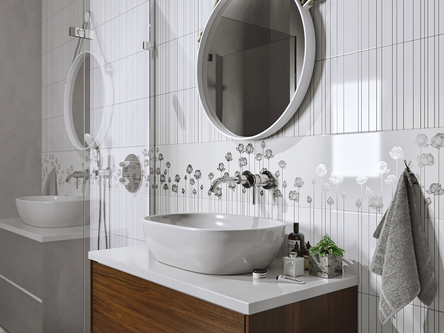 Коллекция "Айс", декор "Цветы" выполнена с нанесением материала с нанесением натуральной платины. Напоминает штрих-код. Отлично подходит для отделки ванной комнаты.