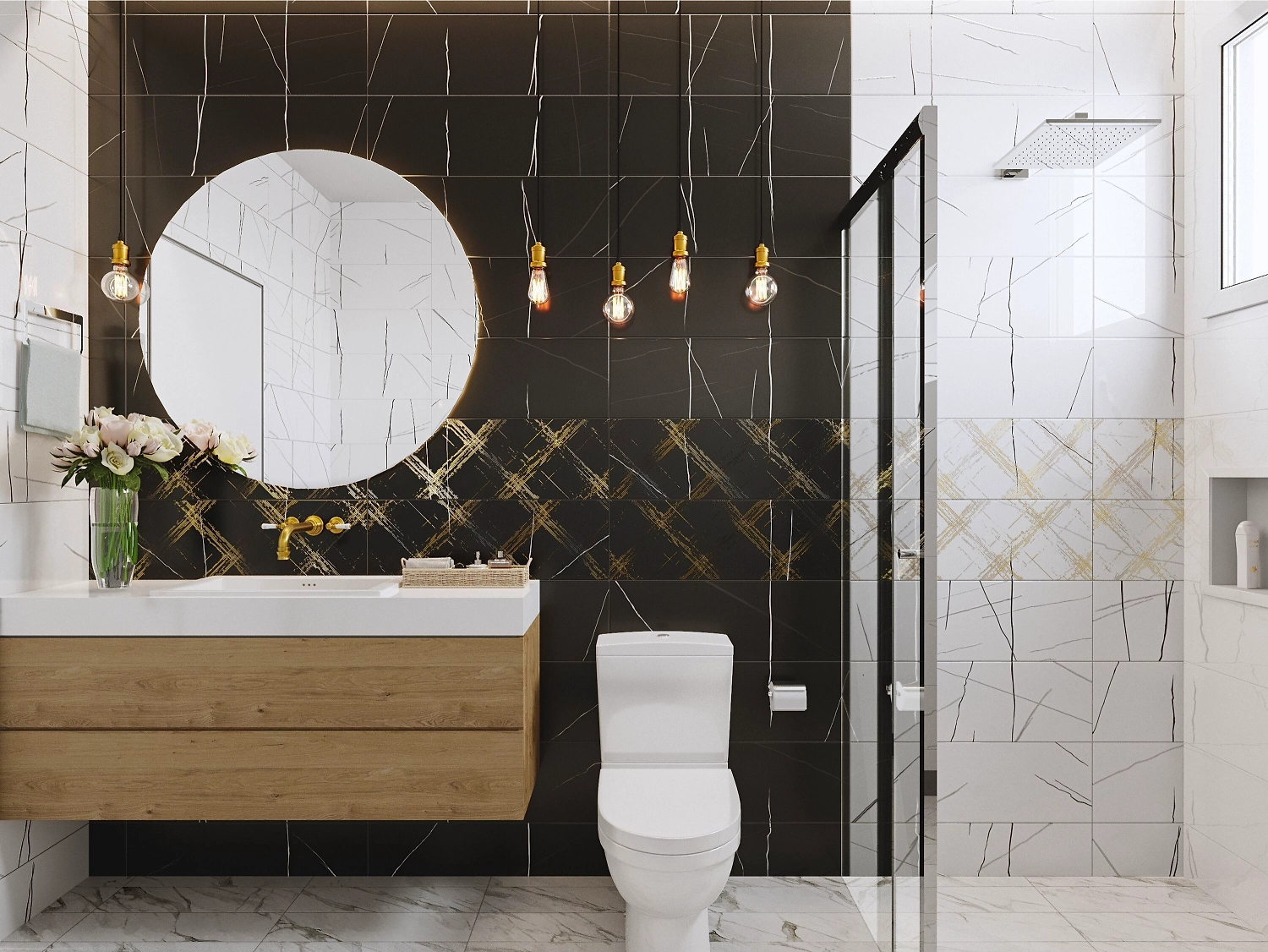 Коллекция "Стратос", глянцевая поверхность, динамичный декор в золоте в стиле рок-классика. Используется для отделки стен в городской квартире, загородном доме.