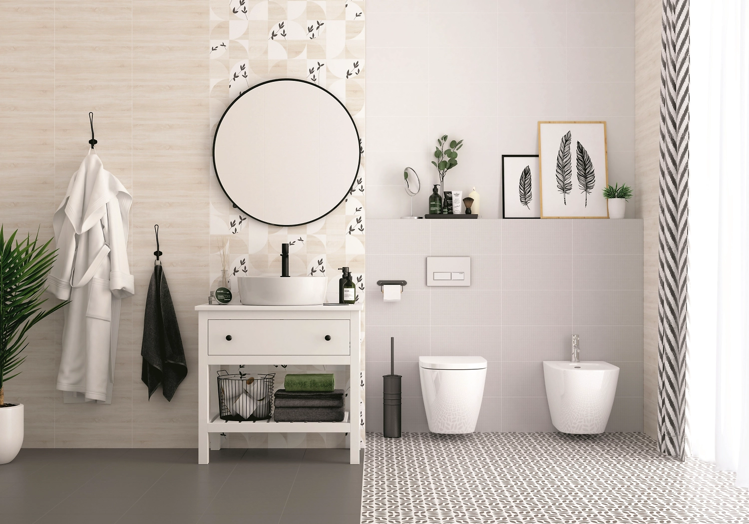 Базовые цвета плитки и керамогранита в коллекции Джапанди / Japandi универсальны и отлично сочетаются, а в декоре гармонично смешаны растительные принты, полукруги, полоски и трендовая