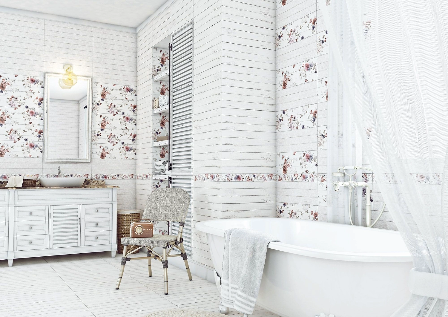 Панно LB CERAMICS Шебби-Шик используется для облицовки стен в ванной, туалете, на кухне и в других помещениях, эффектно сочетается с фоновой плиткой и керамогранитом из той же коллекции.