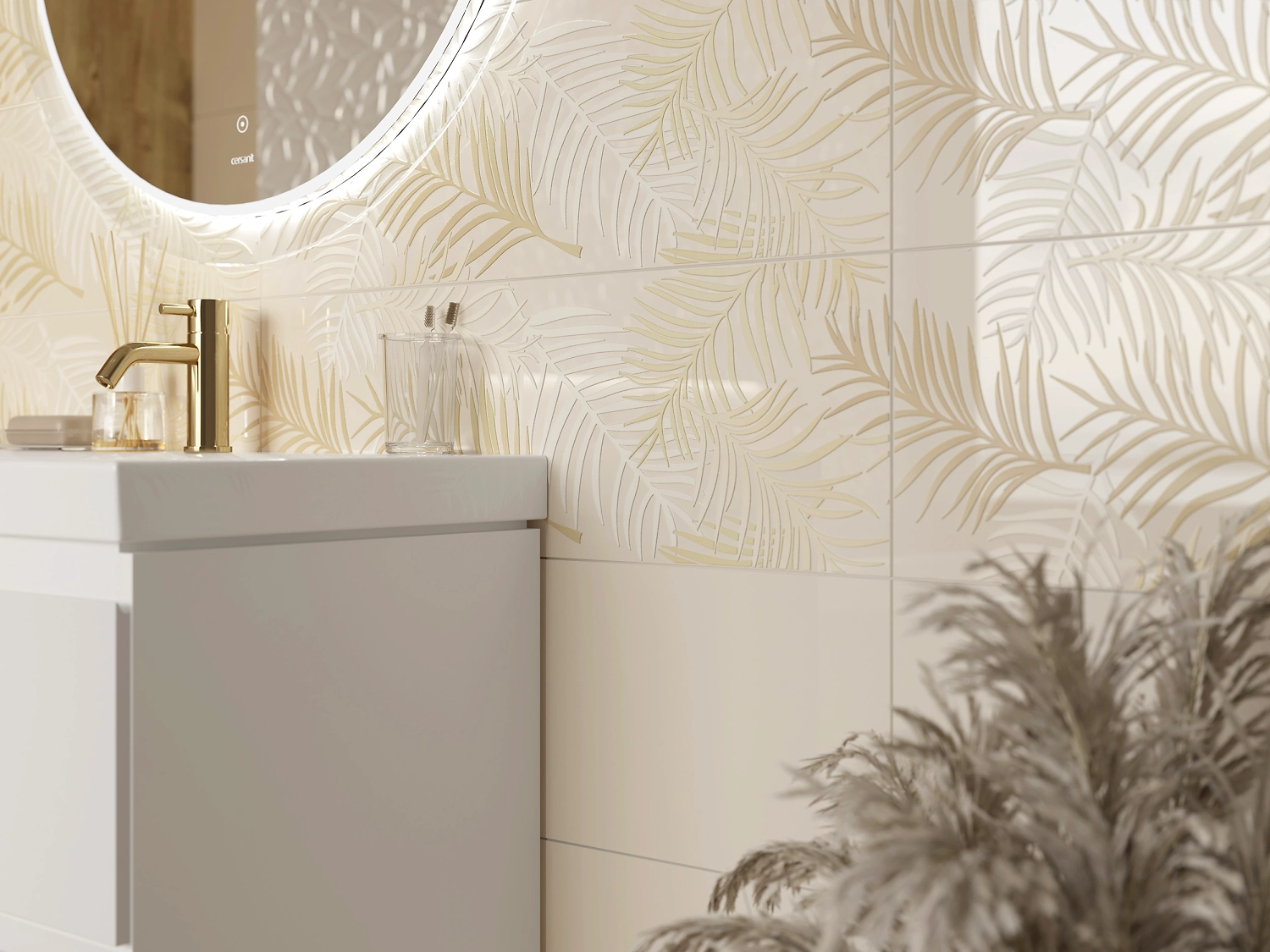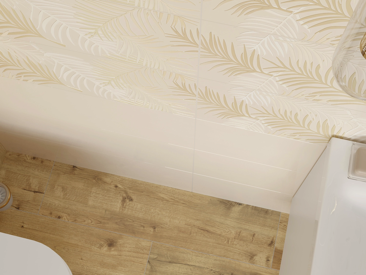 Современное интерьерное решение Chance объединило глянец с матовым "деревом" и металлическим бордюром. Комбинация плоских поверхностей крупноформатной настенной плитки формата 25х75 с рельефной - трендовый приём в отделке, ставший основой дизайна микса. Растительные мотивы декорации, выполненной люстром двух оттенков, перекликаются с рельефной плиткой в форме мелких листьев, подчёркивая концепцию. Рисунок стыкуется во все стороны, что позволяет эффективно зонировать пространство или выкладывать большие панно. Рустикальная "деревянная доска" Wood Concept Rustic формата 22х90 станет акцентом в тёплой бежевой гамме базы и декора.
