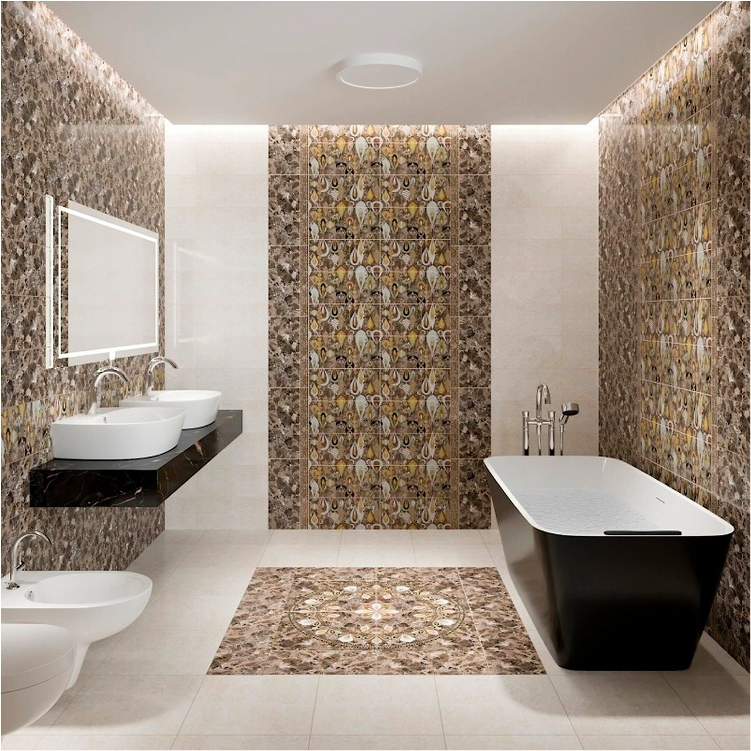 Сделать дизайн ванной комнаты или бассейна максимально приближенным к мотивам богемной роскоши поможет коричневый облицовочный керамогранит Cersanit из коллекции Ingir. Материал имитирует мраморную поверхность с золотистыми проблесками.