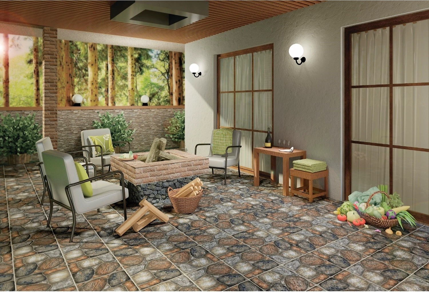 Плитка напольная из керамогранита с рисунком, имитирующим брусчатку, предназначена для укладки на кухнях, в ванных комнатах, террасах, вокруг бассейнов.