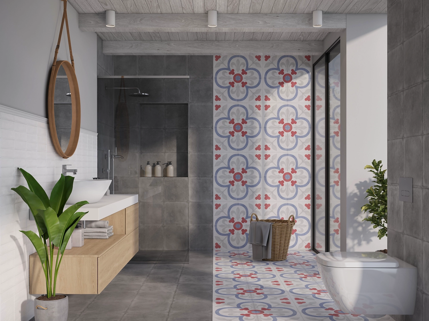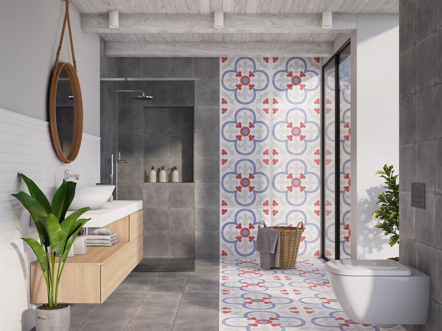 Сочетание монохромного бетона с ярким пэчворком открывает простор для творческих экспериментов в дизайне интерьера.