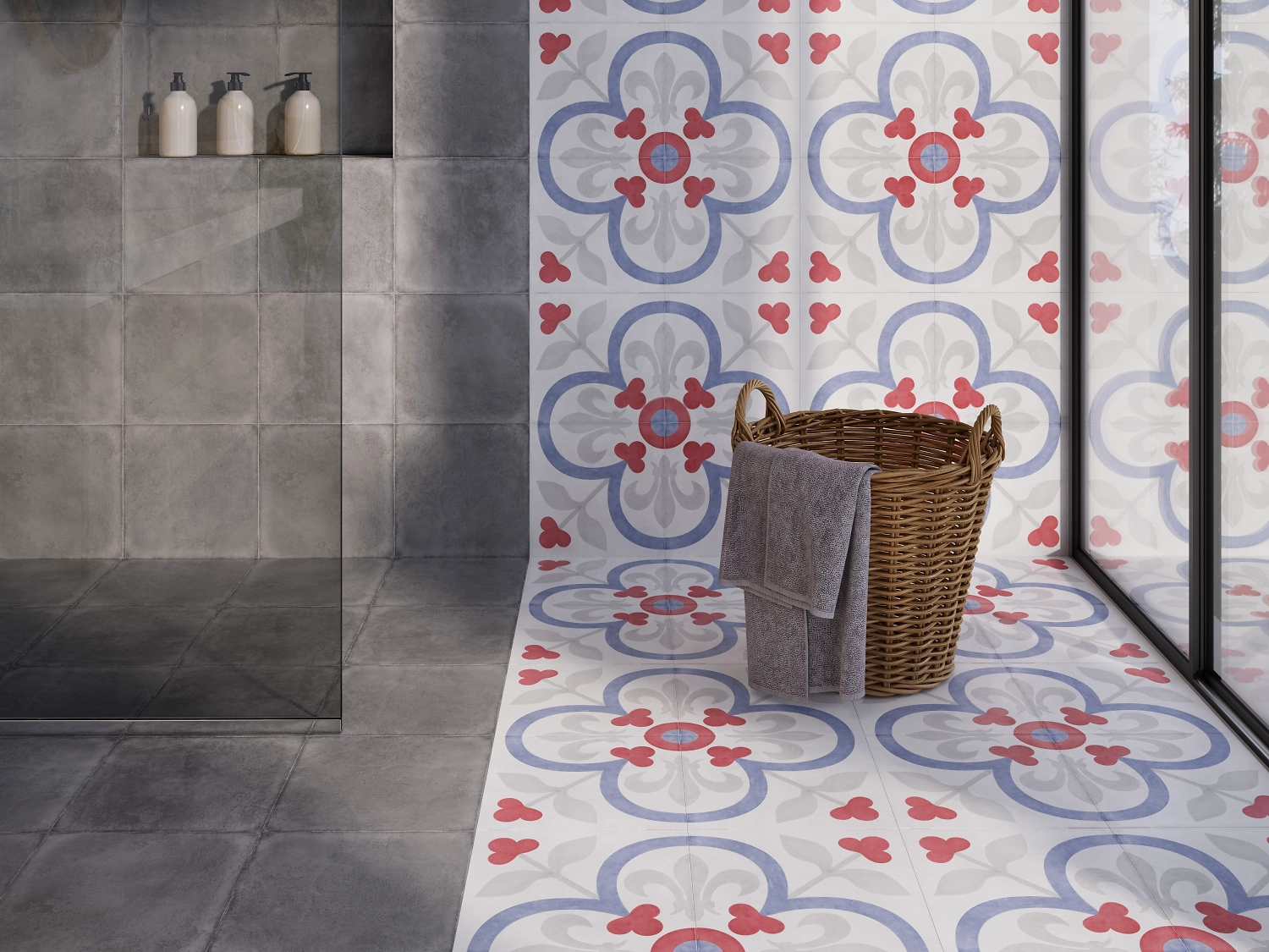 Коллекция Motley состоит из фоновой плитки, стилизованной под бетон, и декоров в ультрамодном стиле пэчворк. Из монохромных элементов, флористического орнамента и геометрического рисунка можно выкладывать как классические ковры, так и эффектные современные композиции.