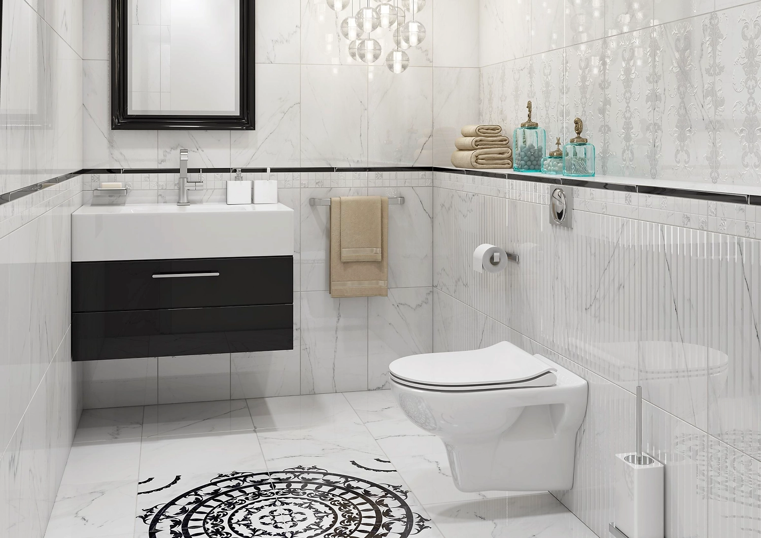Коллекция Oriental от производителя Cersanit - воплощение элегантности и особого шика. С ее помощью можно создать действительно благородную обстановку в ванной комнате. Глянцевая поверхность очень точно передает прожилки, характерные для натурального мрамора, за счет чего получается изысканный интерьер в восточном или античном стиле. Коллекция дополняется декоративными вставками с растительным орнаментом, стеклянным бордюром и декоративным напольным панно с контрастным черным орнаментом.