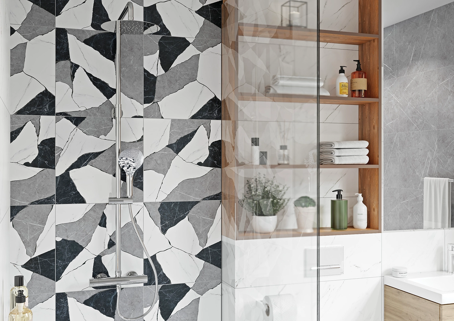 Дополнением белой "мраморной" коллекции керамогранита ORIENTAL стал серый и чёрный керамогранит формата 42х42 с ярким декором. Прочный отделочный материал имитирует мрамор и серый камень. Белые прожилки и неповторяющийся рисунок придают изображению правдоподобность. Декор - это фрагменты базы, собранные в рисунок. Яркая и стильная плитка подходит для зонирования пространства, расстановки акцентов и создания переходов между базовыми цветами.