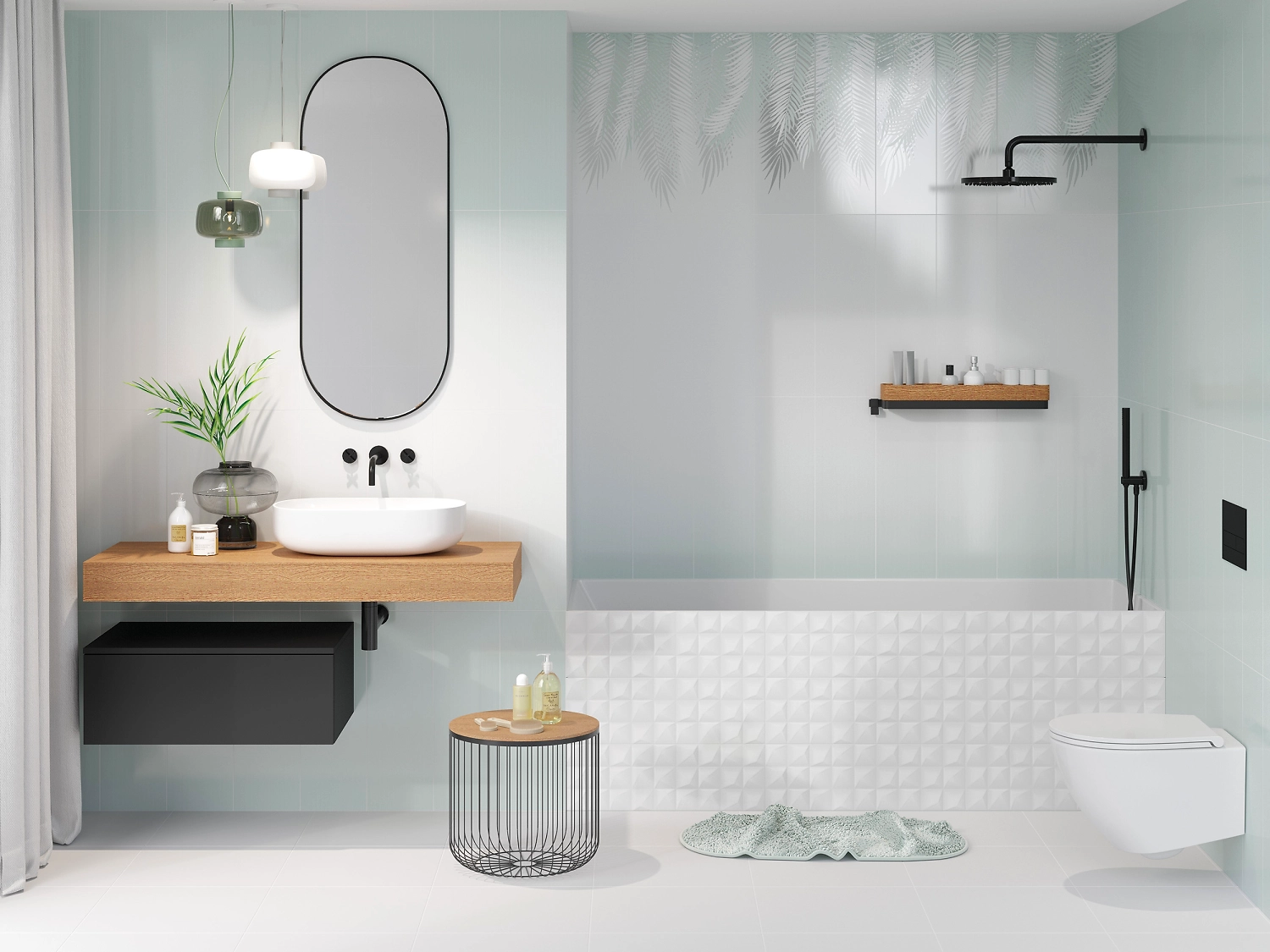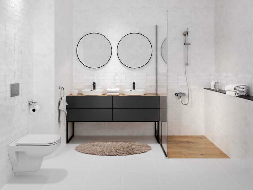 Белоснежный пол в ванной комнате создает атмосферу свежести и чистоты, смягчает яркие оттенки, настраивает на отдых и расслабление.