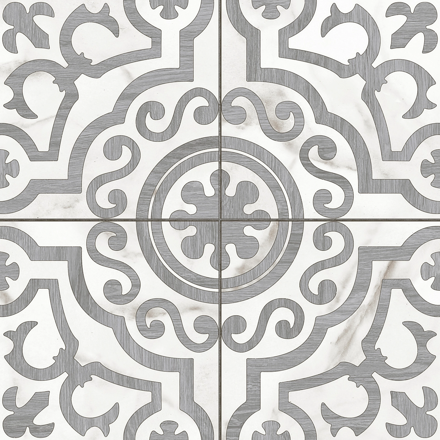 Серые разводы, объёмно выделяющиеся на белом фоне, - это рисунок базового керамогранита коллекции SIENA формата 42х42. Материал имитирует белый мрамор с серыми прожилками.