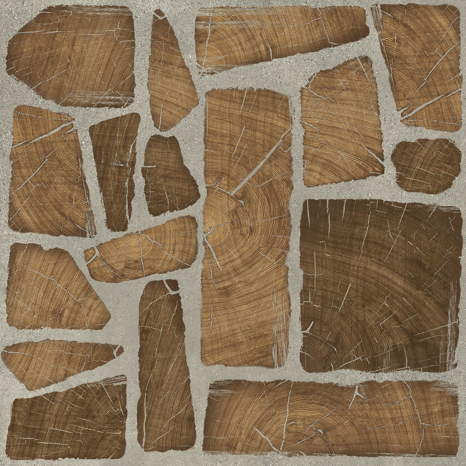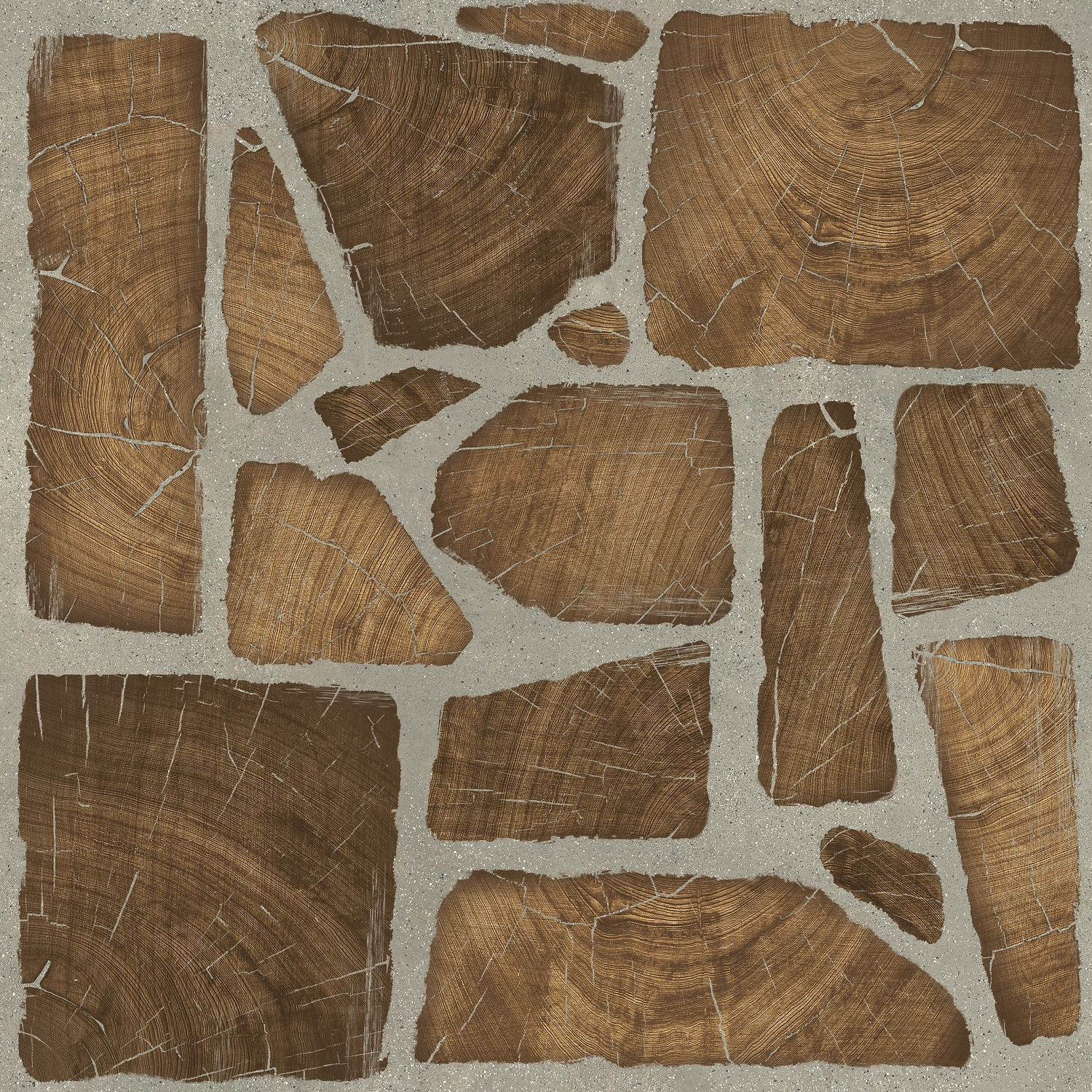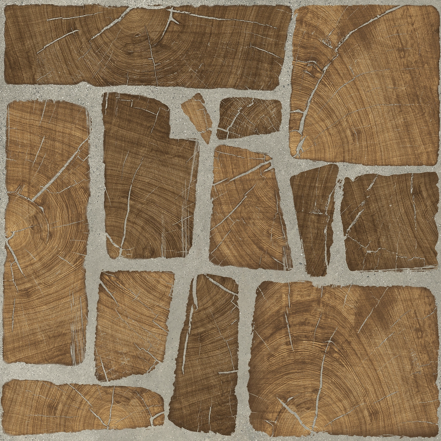 Керамогранит Cersanit Woodland выполнен в формате 42х42 см, имеет мозаичный рисунок в виде деревянных спилов на фоне бетона и приятную матовую поверхность.