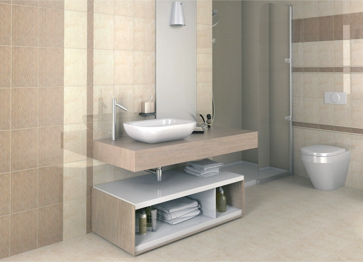 Серия керамики Грация выполнена в спокойных бежевых тонах. Базовая плитка и керамогранит имитируют текстуру натурального камня. Декоры дополнены абстрактным рисунком с изображением волн.