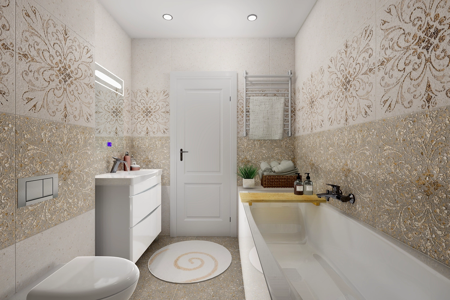 Светло-бежевая плитка для пола дополнена изысканным венецианским орнаментом. Мозаичный рисунок в оформлении создает удивительно красивый мерцающий эффект, который сделает комнату любимым местом для отдыха, а при входе в дом сразу обратит внимание на изысканный вкус хозяев. Керамогранит не требует особого ухода, поэтому его можно чистить любыми бытовыми средствами для уборки.