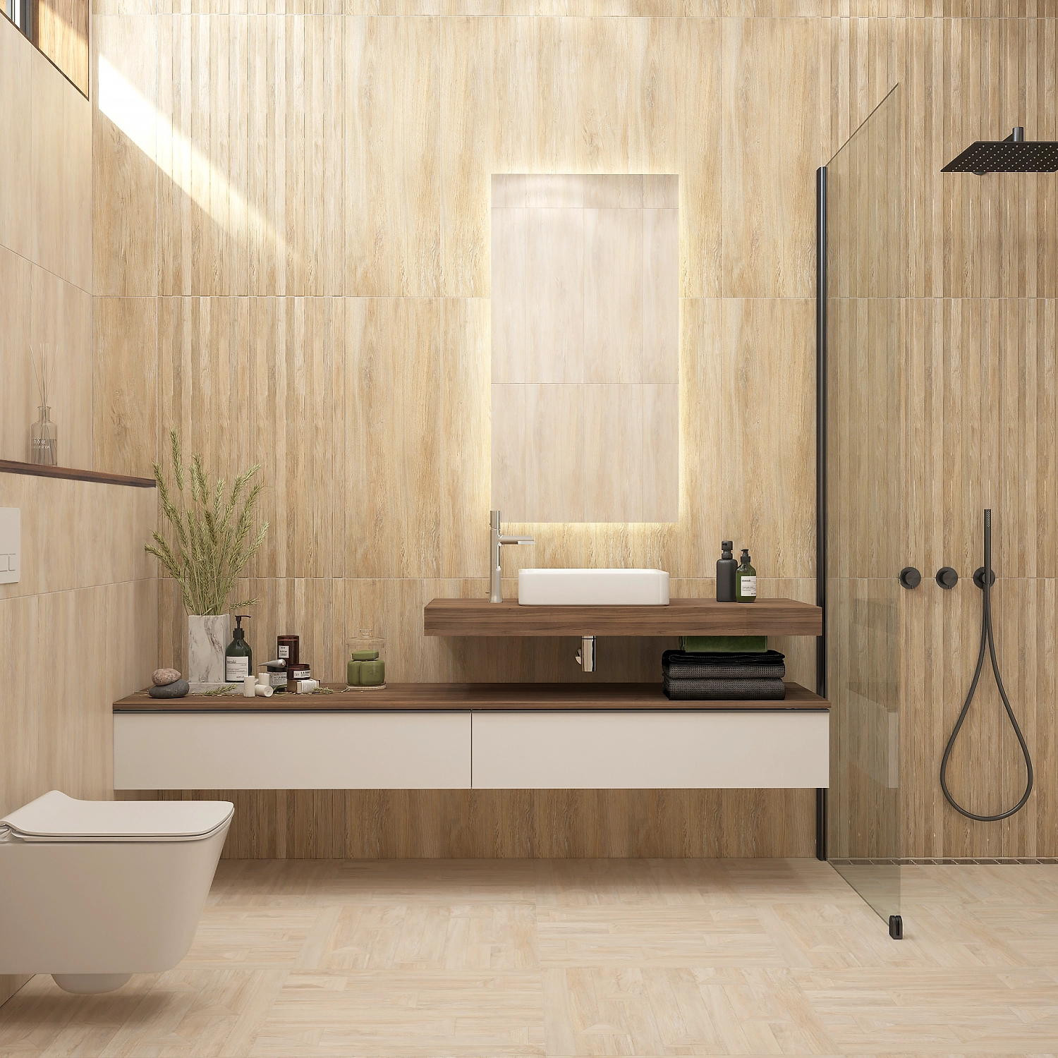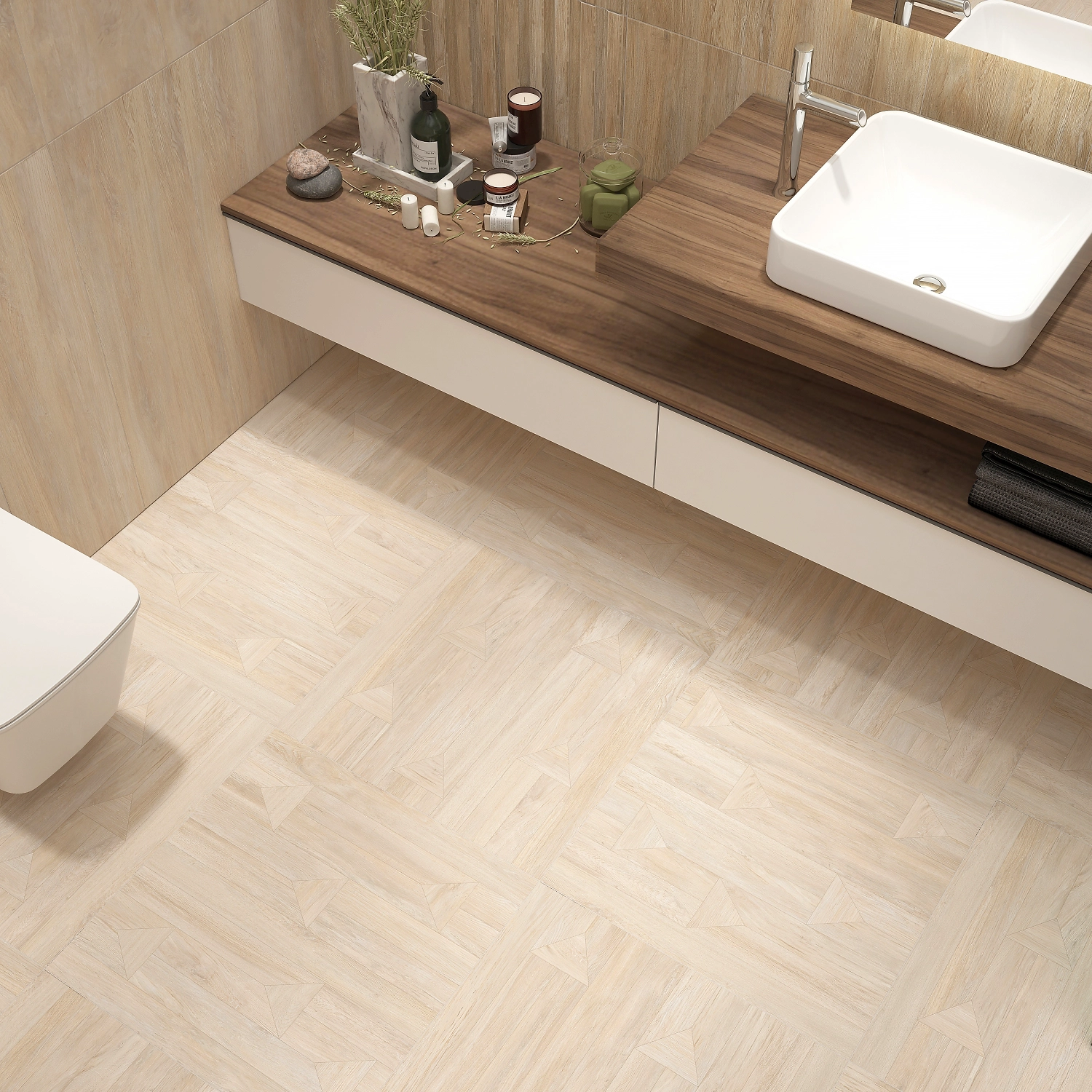 Матовый ректифицированный керамогранит, формата 600х600 мм, представляет собой сочетание деревянных планок и оригинальных треугольных вставок, которое которые создают неординарный рисунок при укладке. Всего в серии три цветовых решения: серый, светло-бежевый и бежевый. Они воспроизводят присущую дереву теплоту и органично впишутся в интерьер спальни, ванной и гостиной.