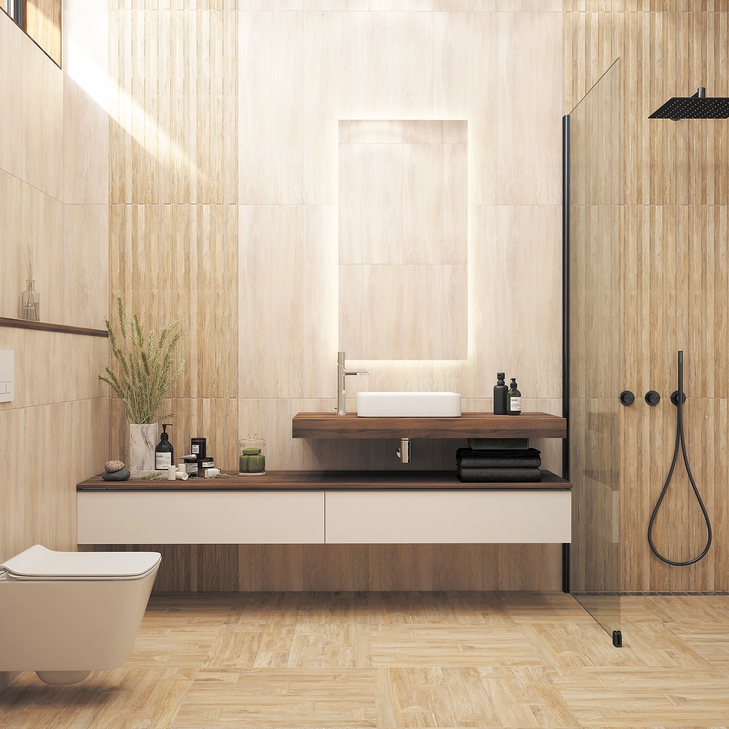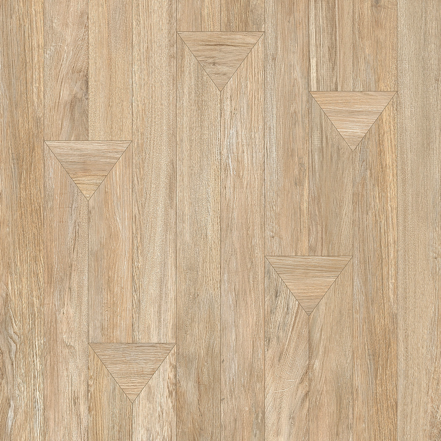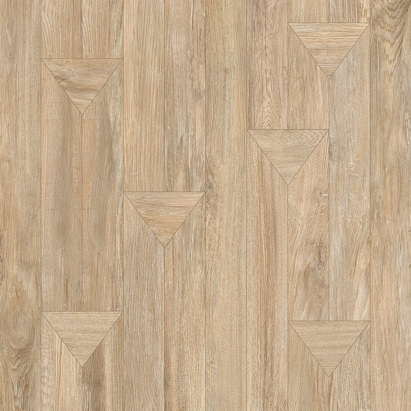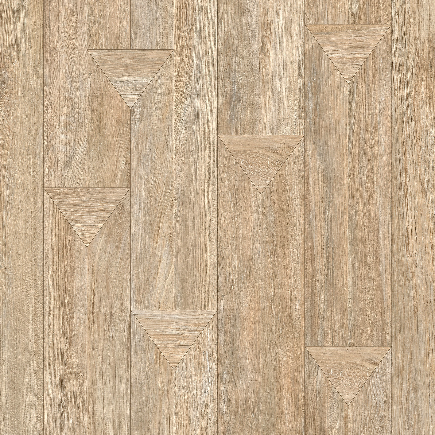 Матовый ректифицированный керамогранит, формата 600х600 мм, представляет собой сочетание деревянных планок и оригинальных треугольных вставок, которое которые создают неординарный рисунок при укладке. Всего в серии три цветовых решения: серый, светло-бежевый и бежевый. Они воспроизводят присущую дереву теплоту и органично впишутся в интерьер спальни, ванной и гостиной.