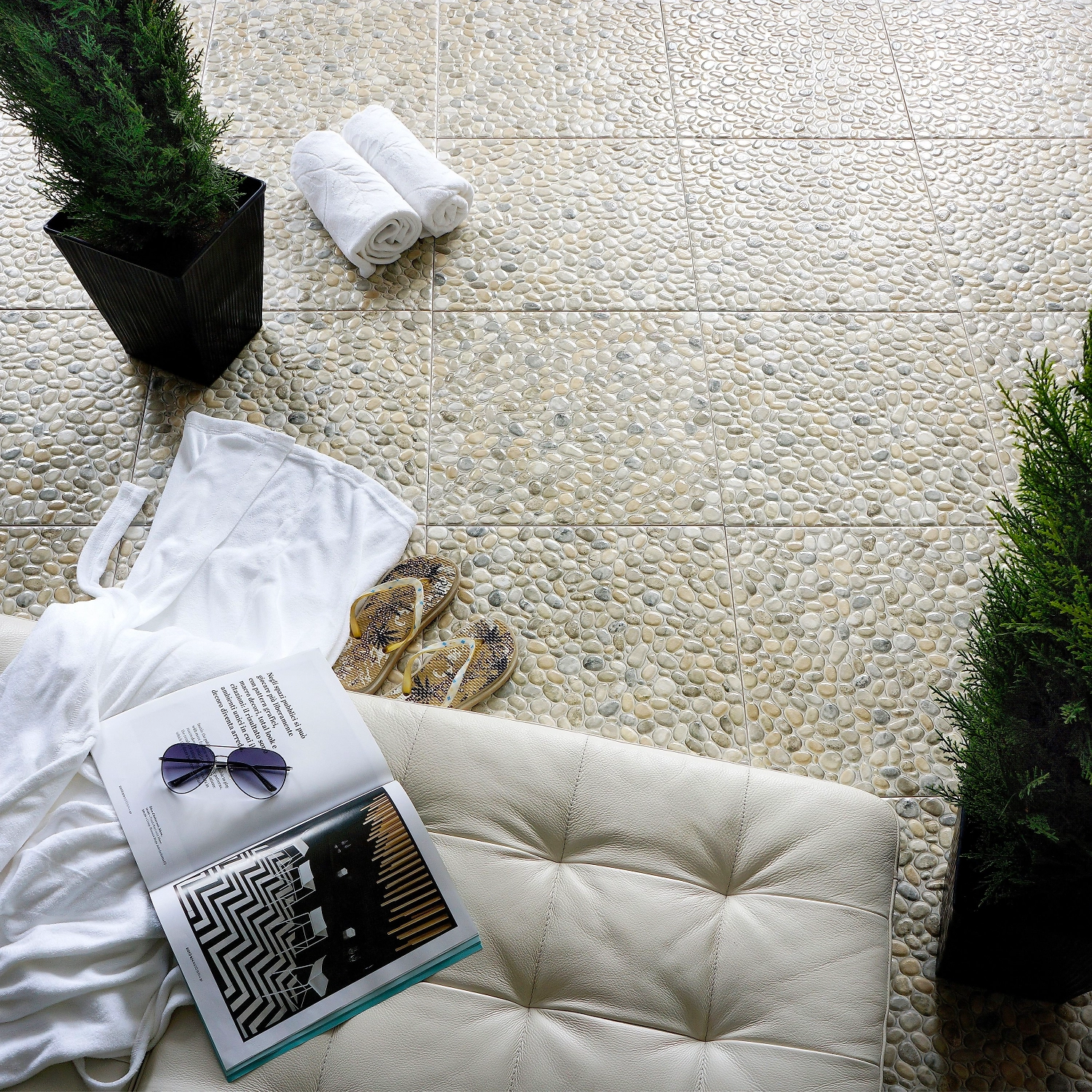 Керамогранит коллекции Миранда используют при отделке ванных комнат, так как его рисунок ассоциируется с водой и берегами южных морей. Благодаря рельефу плитка похожа на настоящую пляжную гальку, приятна для ног и наверняка придется по душе романтичным или истосковавшимся по отпуску натурам.