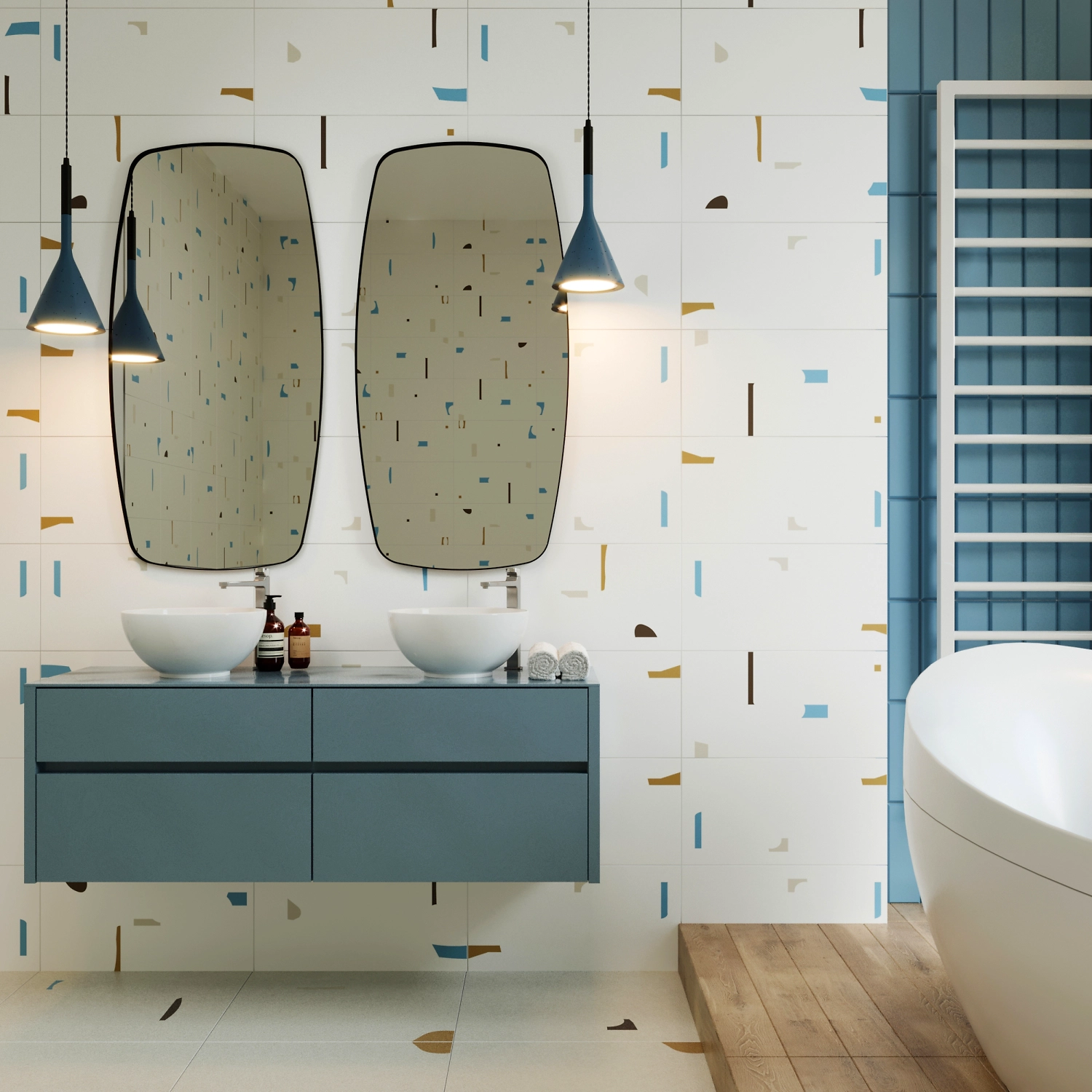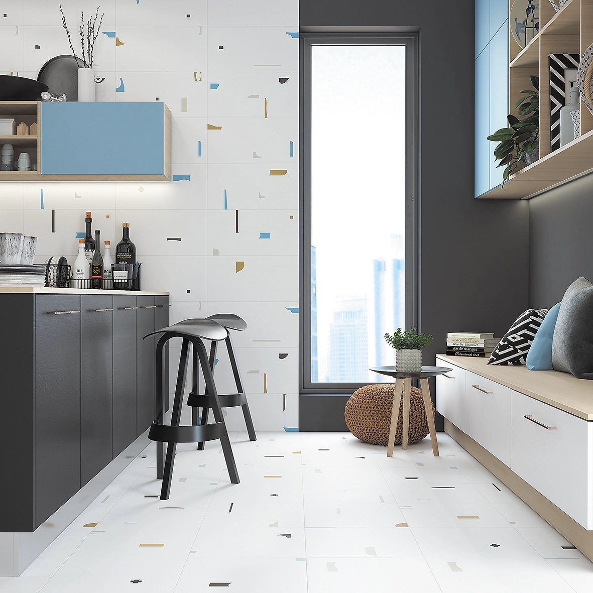 Добавьте в интерьер легкости и воздушности, используя в отделке пола керамогранит Сагано. Яркие хаотично разбросанные мазки голубого, коричневого, охры отлично смотрятся на белом фоне, создают атмосферу весенней свежести и близости к с природе.