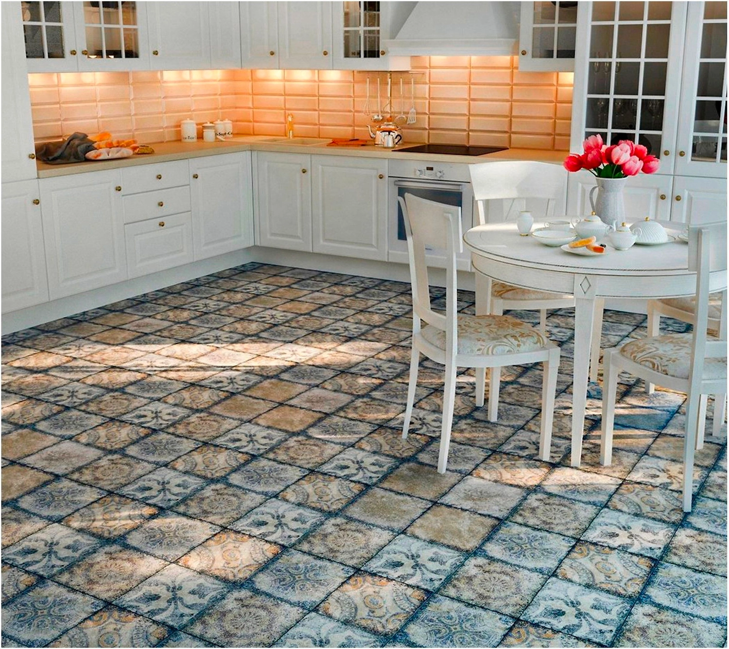 В керамограните Тинторетто органично сочетаются стильный дизайн и прекрасные эксплуатационные характеристики натуральной керамики. Покрытие с матовой поверхностью и оригинальным геометрическим орнаментом напоминает каменную кладку с элементами старинных фресок. Пол, оформленный такой плиткой, смотрится естественно и благородно.