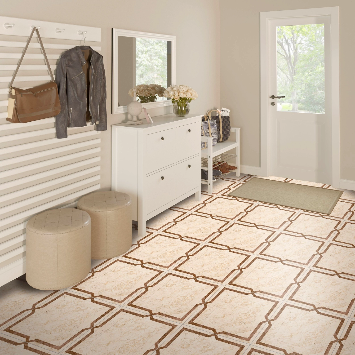 Керамическая плитка Конде станет отличным завершением дизайна интерьера в стиле модерн и эклектика. Поверхность плитки точно передает фактуру натурального камня, а декор по периметру плитки выглядит строго и лаконично. Кант коричневого цвета при стыковке образует большие перекрестия, что придает поверхности пола строгость и в то же время легкость и воздушность. Такой пол делает пространство завершенным, а сам по себе смотрится как самостоятельный декоративный элемент.