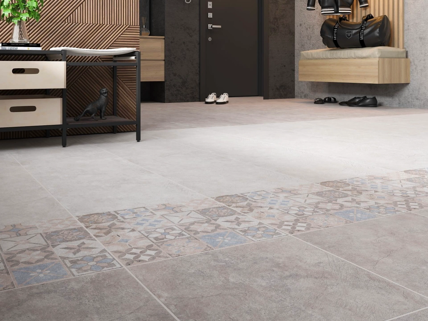 Коллекция керамогранита Македония - идеальный выбор для интерьеров в стиле лофт. Цементные поверхности особенно популярны в современном дизайне. Базовую плитку серого цвета дополняет декор с орнаментом пэчворк.