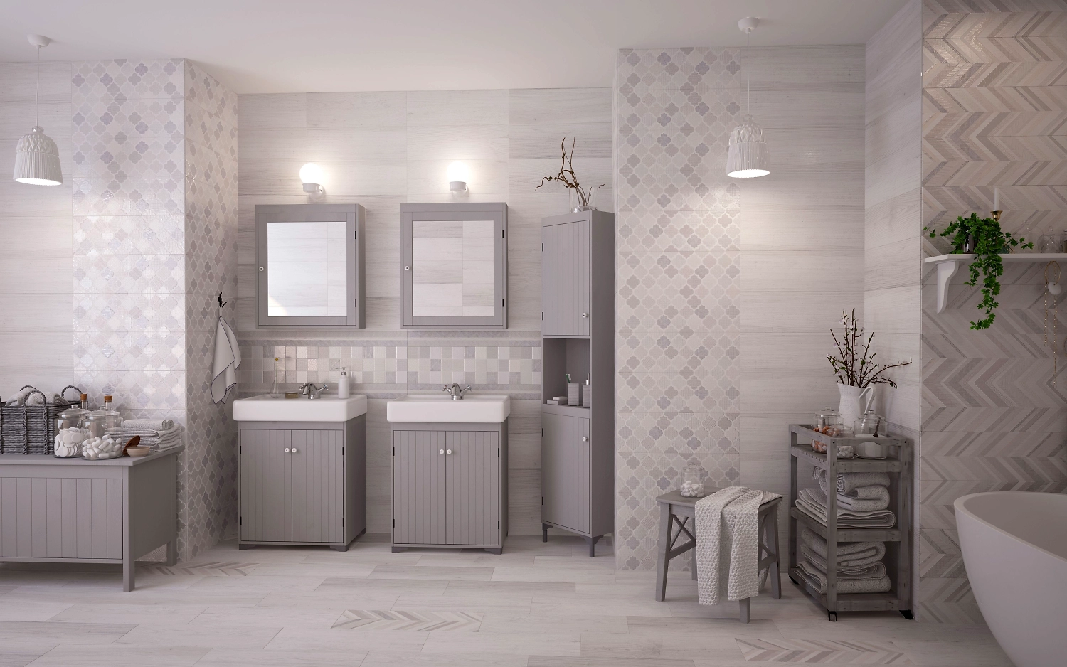Коллекция Норданвинд не случайно вызывает в воображении картины зимнего пейзажа с искрящемся белым снегом и свежестью морозного дня. Норданвинд, в переводе со шведского, означает "Северный ветер". Коллекцию по достоинству оценят те, кому пришелся по вкусу современный и функциональный скандинавский стиль. Светло серебристый цвет керамической плитки зрительно расширяет пространство интерьера, наполняя его светом и воздухом. Текстура дерева добавляет нотку тепла в царство чистоты и прохлады. Декоративный орнамент в виде сложного узора арабского четырехлистника очаровывает игрой бликов на рельефной поверхности. Построенная на сочетаниях нюансов серого цвета, керамическая плитка Норданвинд сможет стать великолепным фоном для разнообразных мебельных композиций, выполненных в лучших традициях шведского дизайна. С помощью коллекции Норданвинд интерьер ванной комнаты наполнится бодрящим дыханием северного ветра.