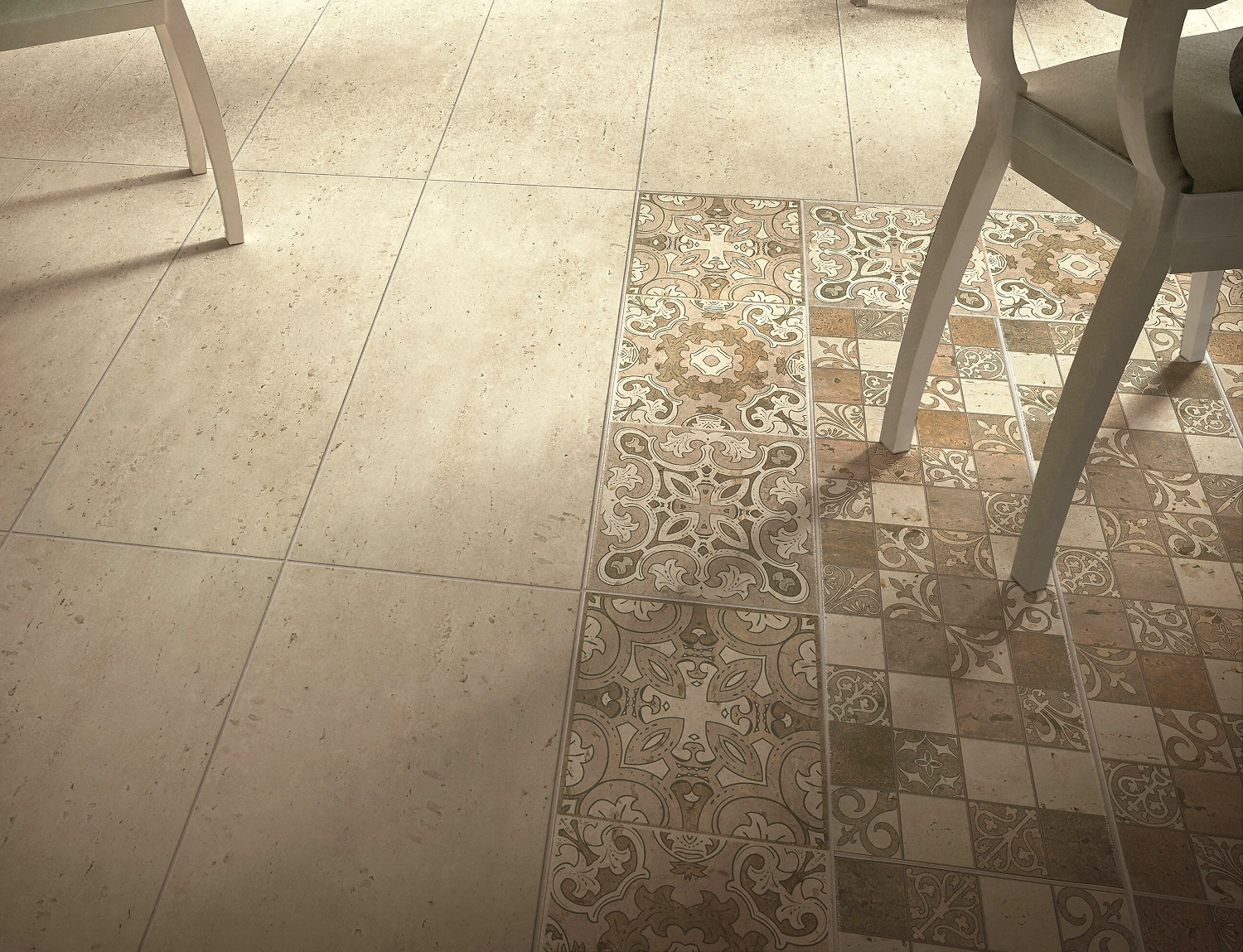 Простота и эстетичность итальянского травертина в сочетании с узорами в стиле пэтчворк придают интерьеру особый шарм. Декоративные элементы коллекции сочетаются как с оттенком "бренди", так и с классическим бежевым. Дизайн коллекции предлагает массу вариантов раскладки керамогранита. Он может использоваться как для пола, так и для стен снаружи и внутри дома.