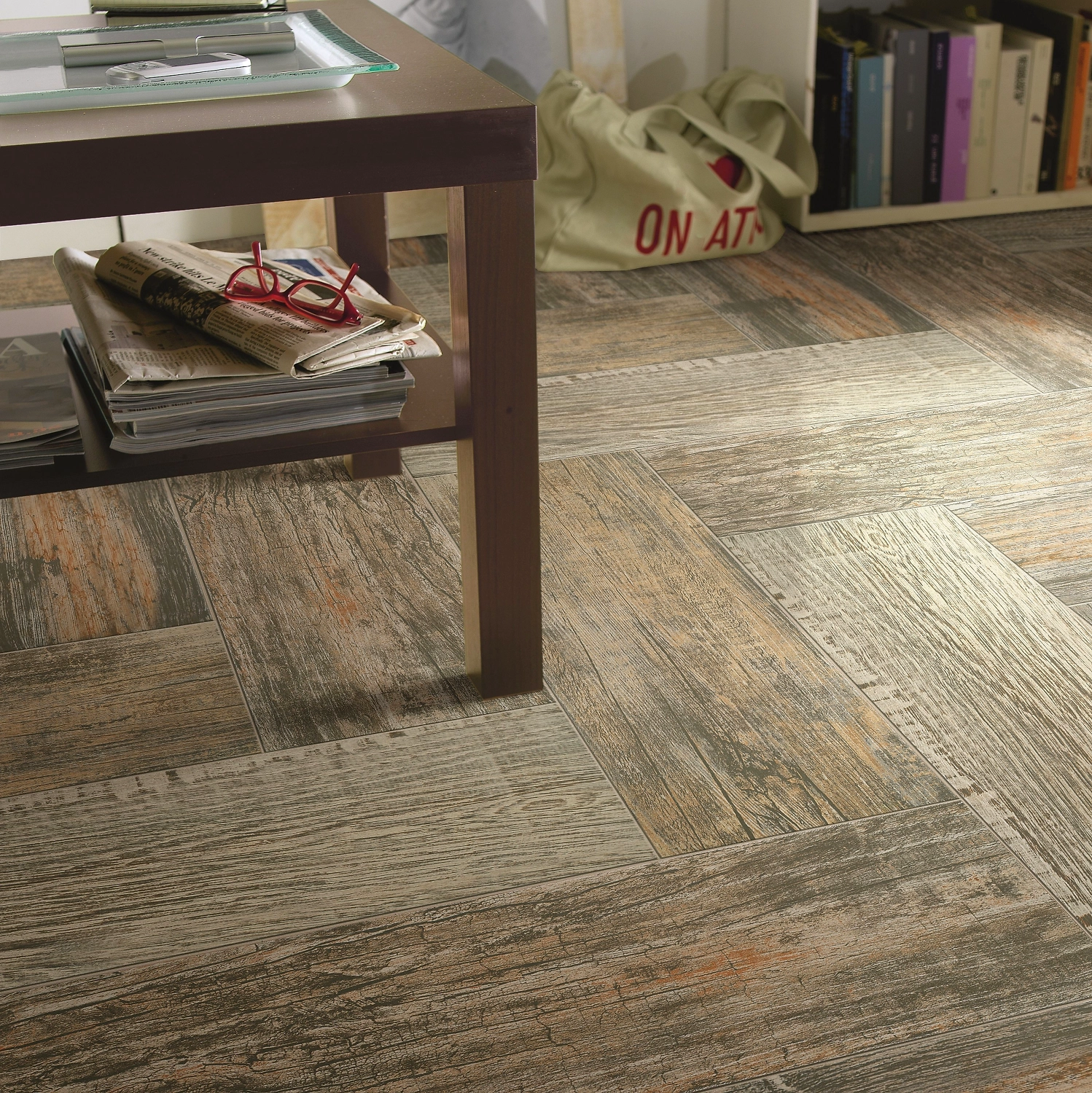 - Керамогранит размером 20x60 см удобно укладывать "палубой" или "елочкой" для большего сходства с натуральным паркетом.