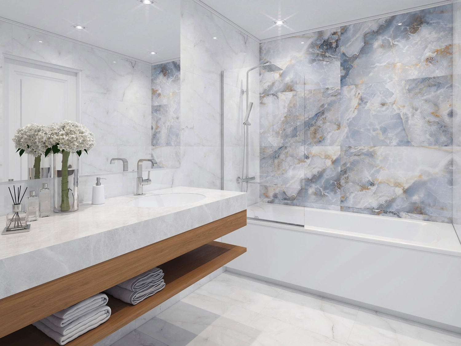Полированный керамогранит под голубой мрамор великолепно смотрится в интерьере ванной, прихожей, гостиной, кухни, холла, подходит для отделки ресторанов, гостиниц, торговых центров, других жилых, коммерческих и общественных помещений.