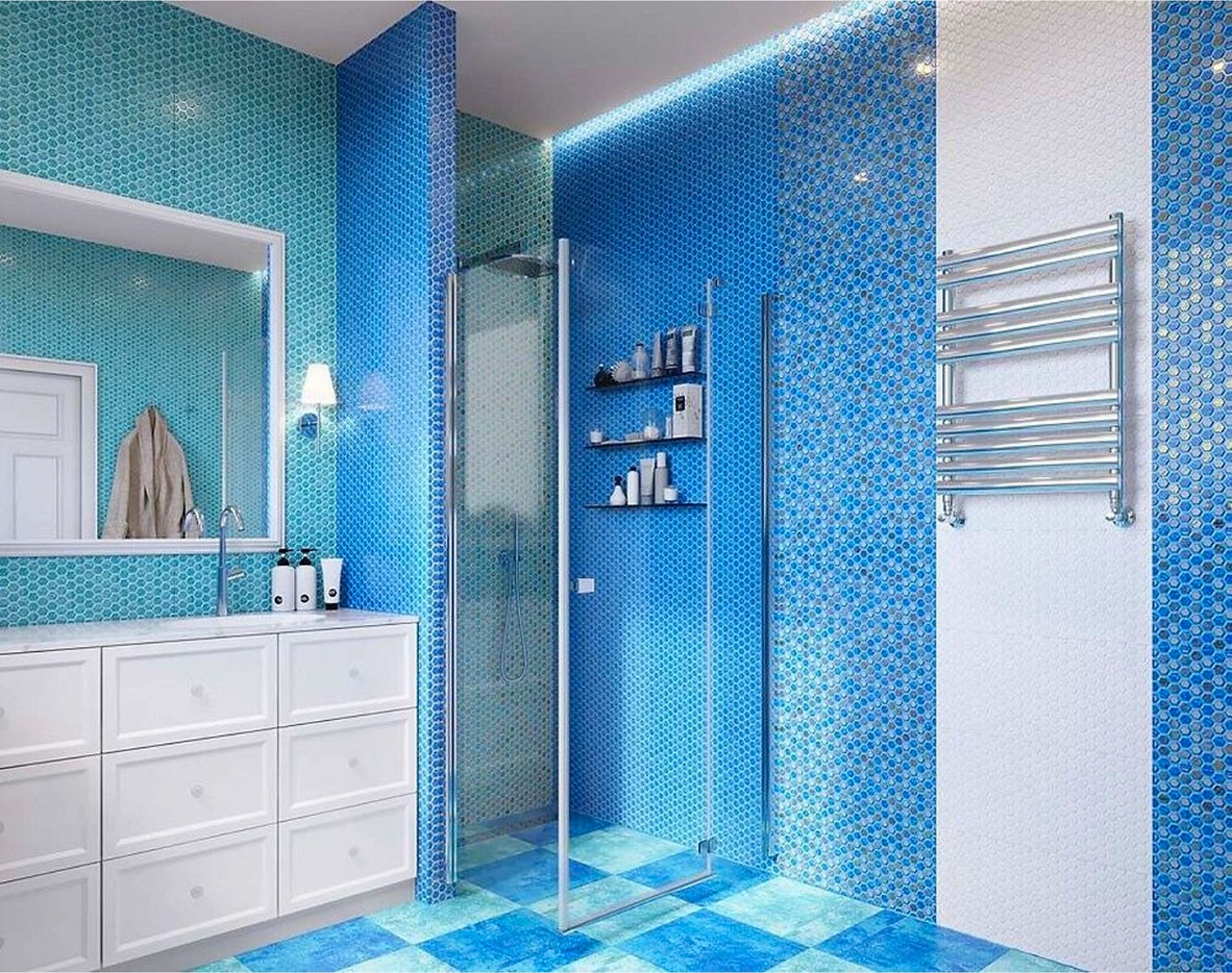Напольное покрытие, выполненное в синих тонах с небесно-голубыми вкраплениями, навевает мысли о море, небе, просторах природы, помогает отвлечься от суеты, увидеть и почувствовать прекрасное в