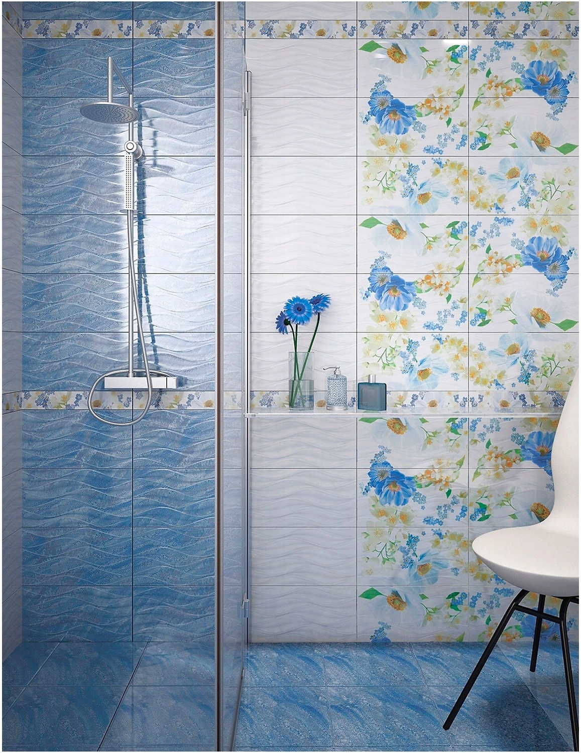 Полотна в голубых тонах идеально впишутся в интерьер ванной. Лазурный оттенок визуально расширяет пространство, придает ему глубины и морского настроения. Наиболее выигрышно такая плитка смотрится в тандеме с белым, молочным и серебристым цветами.
