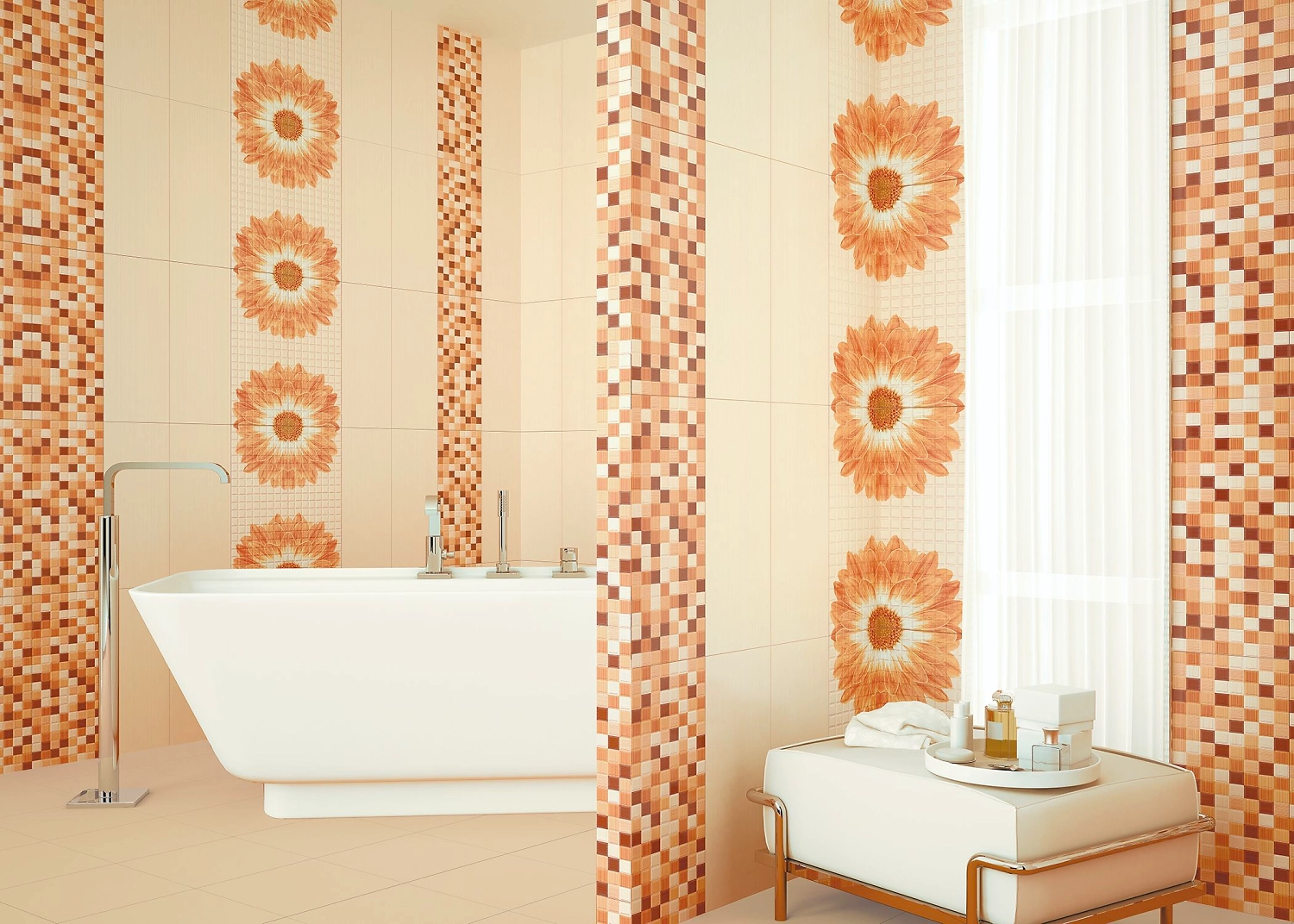 Напольная плитка Mariscos - прекрасное сочетание оттенков от светло-бежевого до насыщенного коричневого. Предназначена для оформления ванных комнат. Однотонный вариант с матовой поверхностью является прекрасным фоном для плитки с флористическим орнаментом и цветной мозаикой. Прекрасно отражает свет и визуально увеличивает размеры помещения. Вставки с изображением прекрасного бутона герберы привносят в дизайн комнаты ярких красок и летней свежести. Такая плитка - готовое решения для тех, кто любит ощущение комфорта и умиротворенности.
