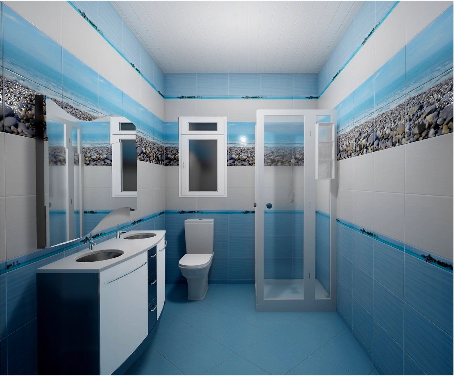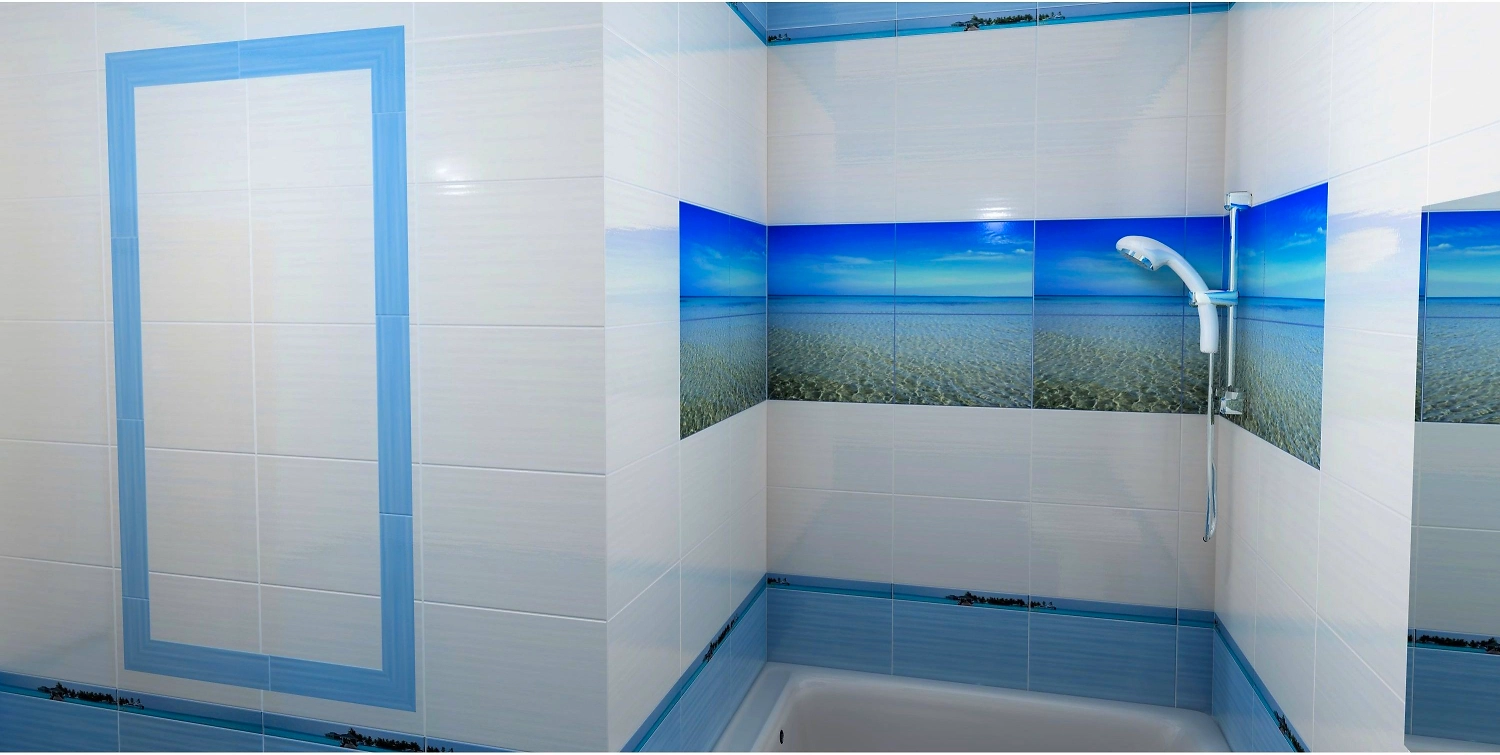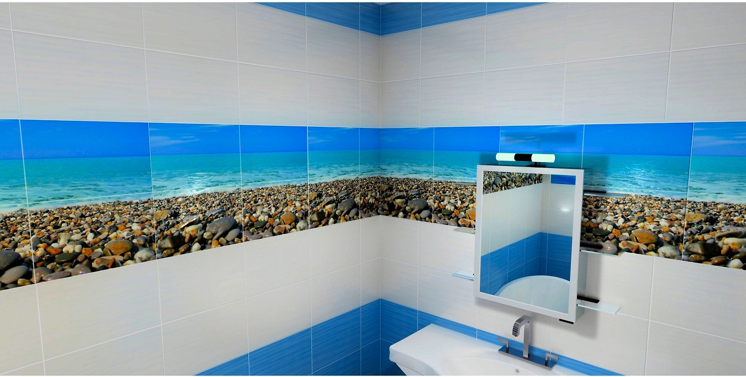 Плитка выполнена в универсальном чистом и приятном голубом цвете, который допускает использование в различных сочетаниях. Неравномерная текстура способна с легкостью обеспечить антискользящий эффект пола в ванной комнате (что является существенным плюсом) и отдаленно будет напоминать о галечных морских берегах.