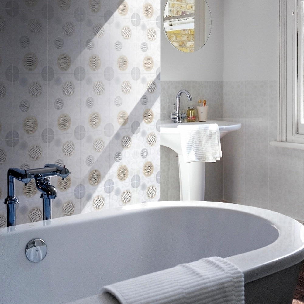 Напольная плитка с легкой тканевой фактурой органично впишется в небольшое помещение ванной комнаты или кухни. Монохромное изображение окружностей и шаров на белом фоне добавит в повседневную жизнь ярких эмоций и позитивного настроя. Кроме того, светлый пол - это всегда нарядно и стильно. Такая облицовка будет хорошо сочетаться со светлой мебелью в стиле хай-тек или техно.