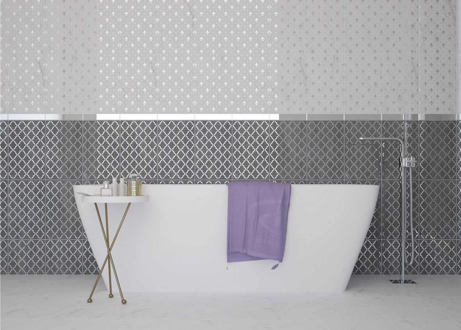 Черно – белая классика , выполненная под брендовые мрамора: CALACATA и NEGRO MARQUINA в коллекции MIDDLE AGE вместе с декорацией в виде королевской символики и в виде стилизованных зеркал в купе с полами MIDDLE AGE BLANCO и черный MIDDLE AGE NERO настоящее воплощение королевской ванной комнаты.