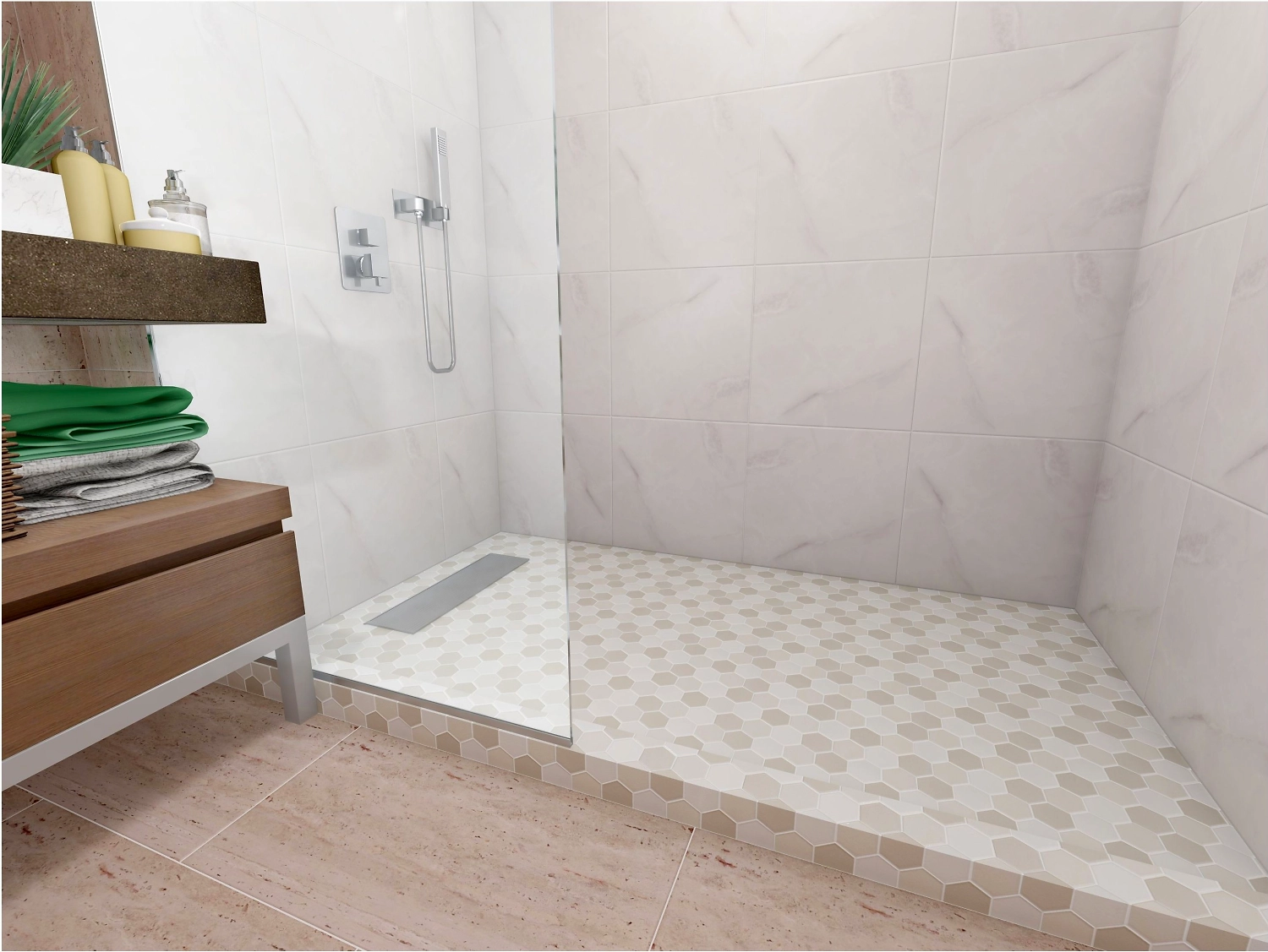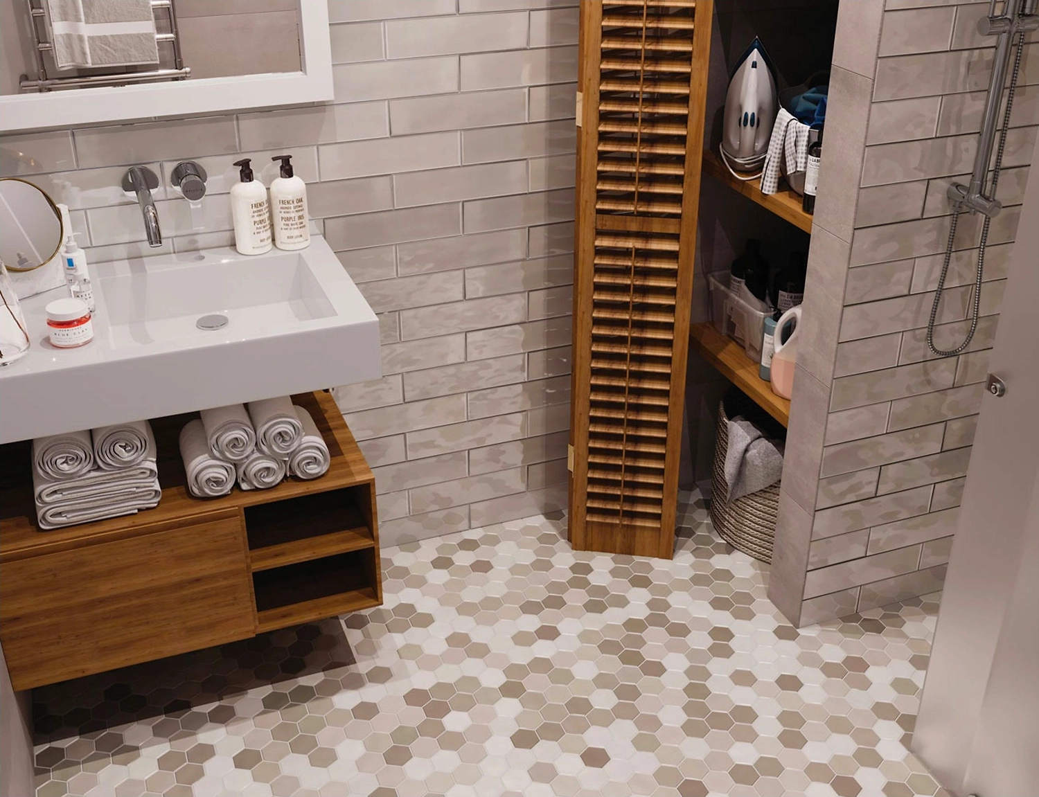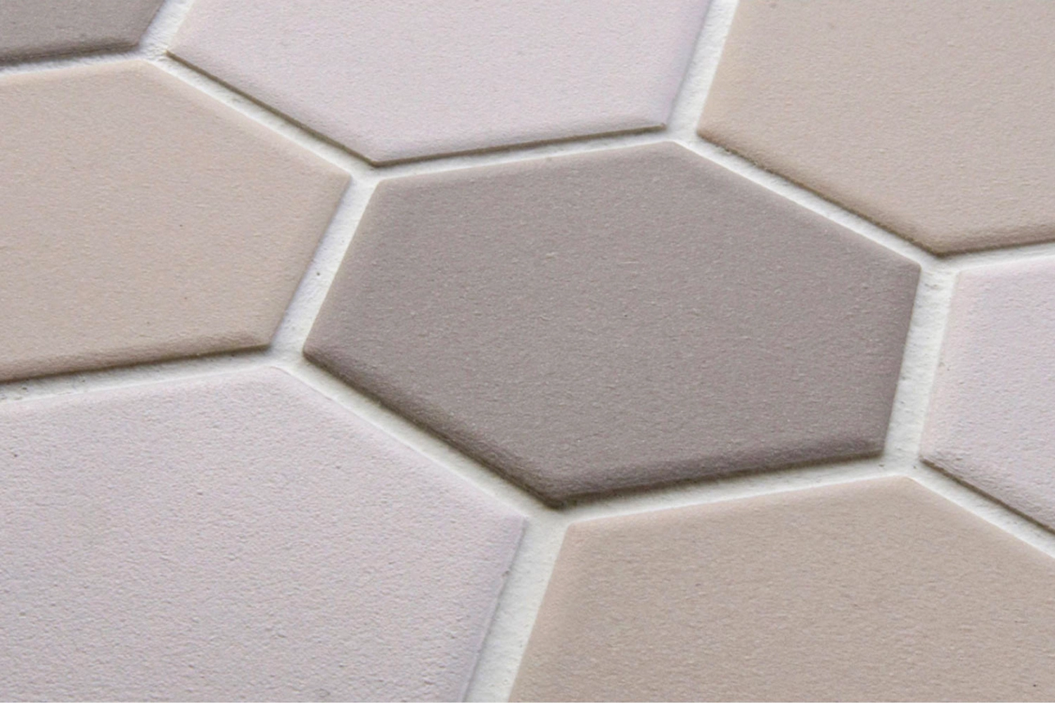 Керамическая мозаика бренда StarMosaic в бежевых оттенках в современной форме шестигранника и шероховатой противоскользящей поверхностью.