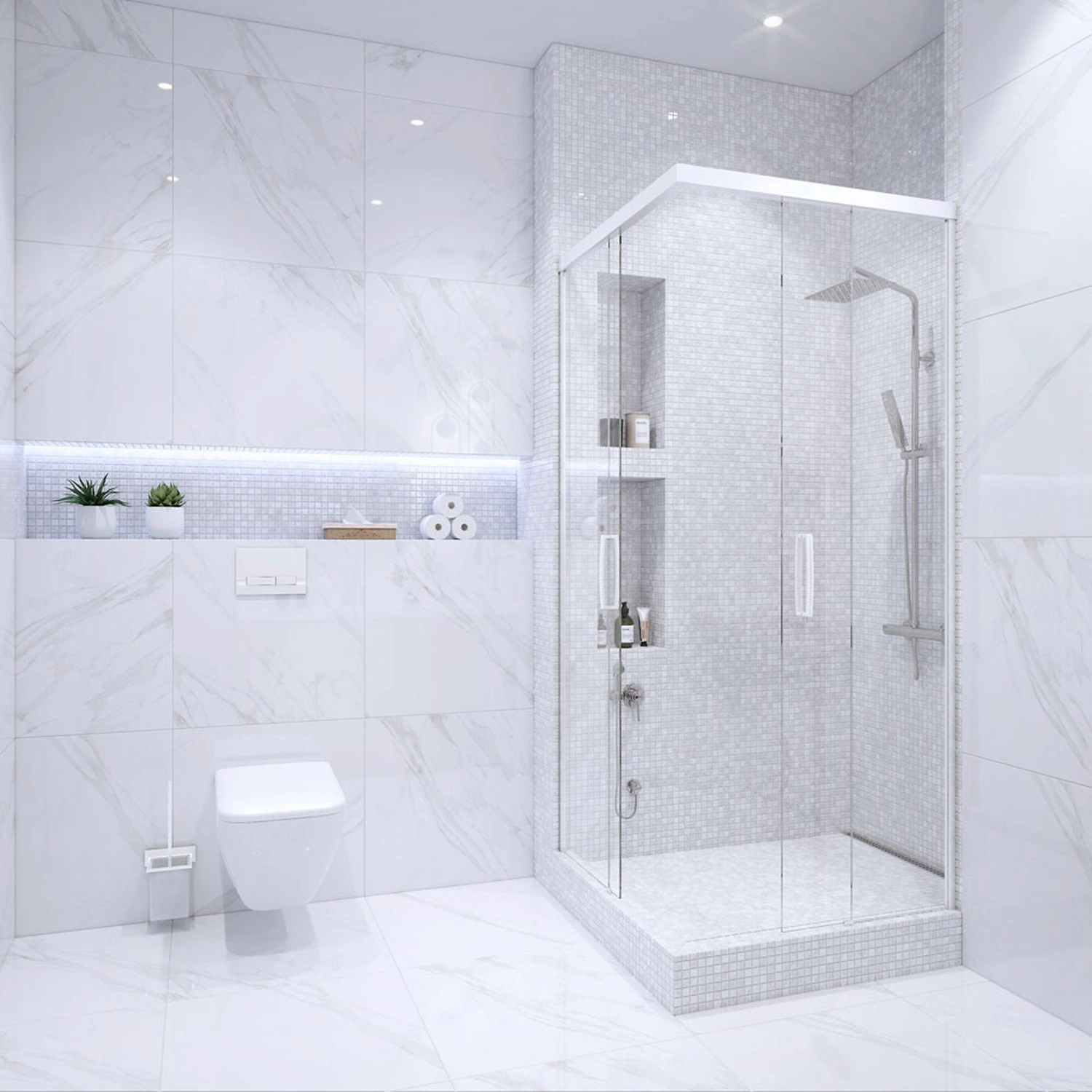 Мозаика бренда StarMosaic из снежно-белого мрамора с мягкими серыми прожилками и полированной поверхностью является одним из популярных материалов для интерьеров ванных комнат, спа или кухонь.