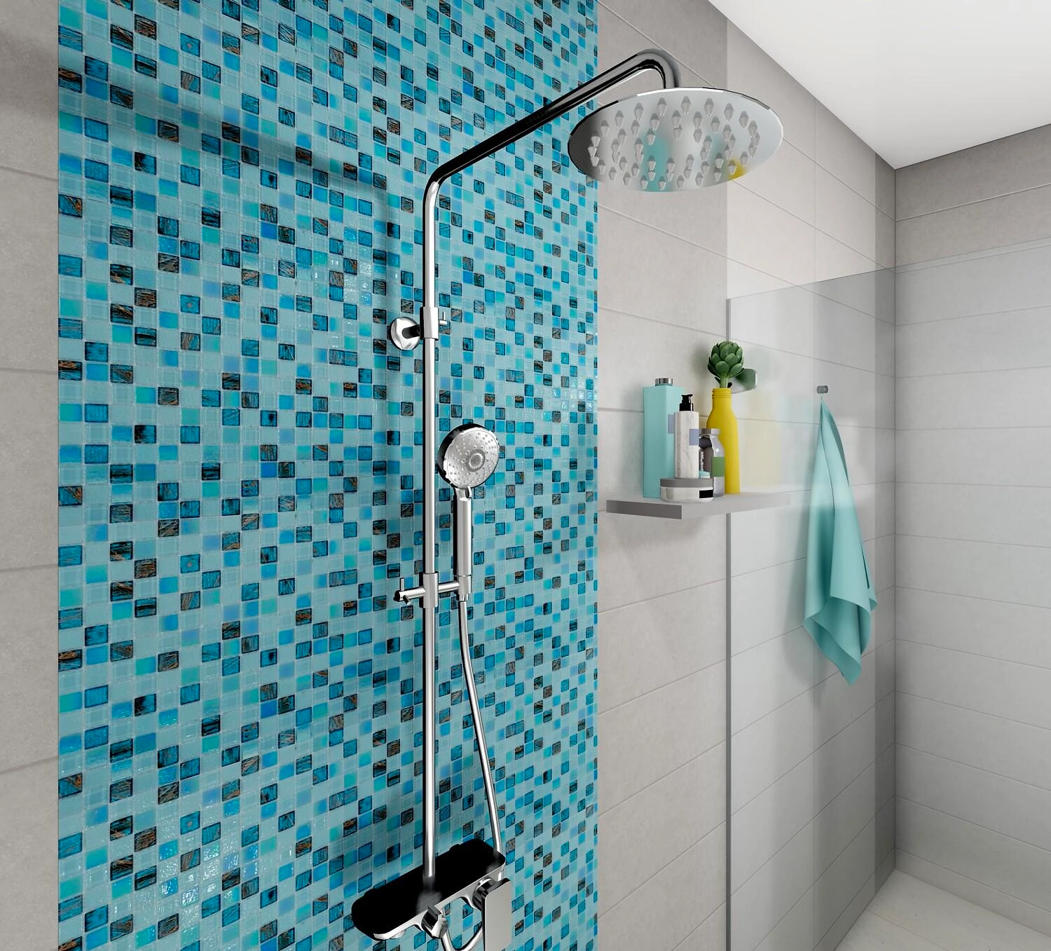 Кубики стеклянные цветные комбинированные из термоплавкого и хрустального стекла для мозаичных работ на основе-сетке из полиэстера, размеры кубиков: 20x20x4 мм, размеры мозаичного полотна: 306x306x4 мм, предназначены для декорирования стен.