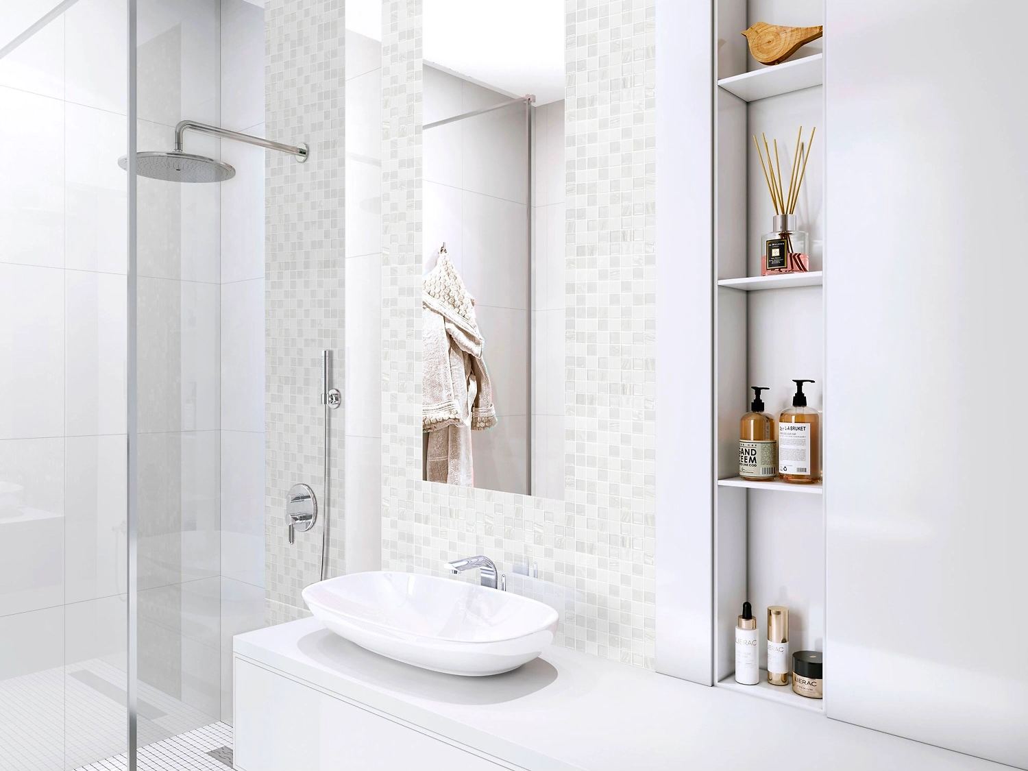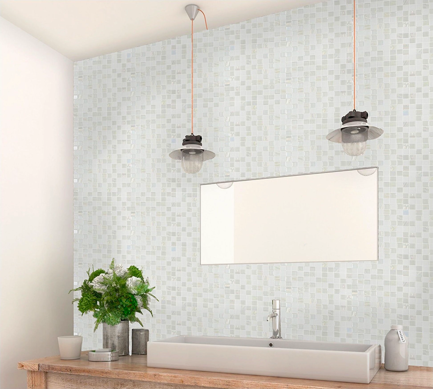 Стеклянная мозаика испанской фабрики Vidrepur Astro белая подходит для облицовки любых сантехнических помещений, кухни, бассейнов и спа. Поверхность мозаики это микс гладких и объемных блестящих элементов, которые делают поверхность стен изящной и привлекательной.