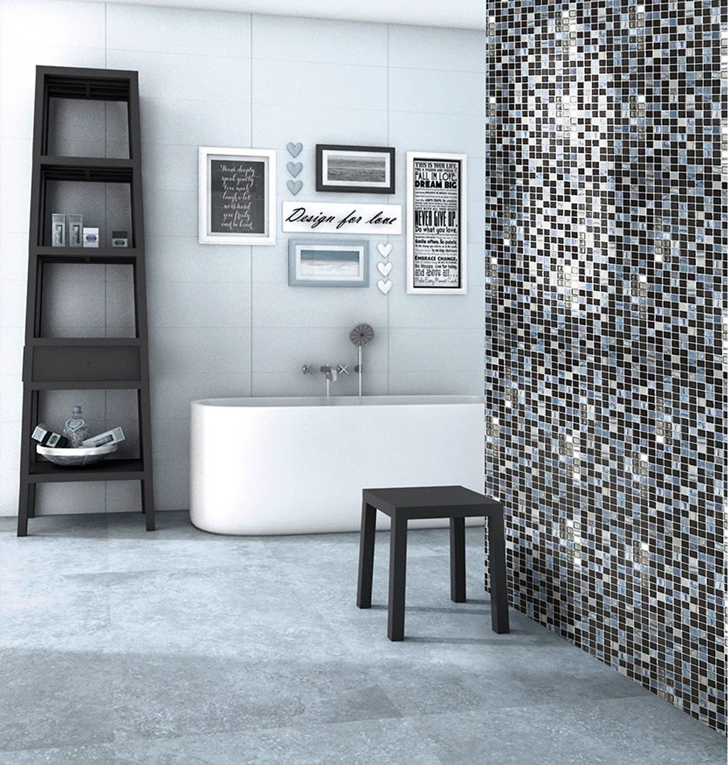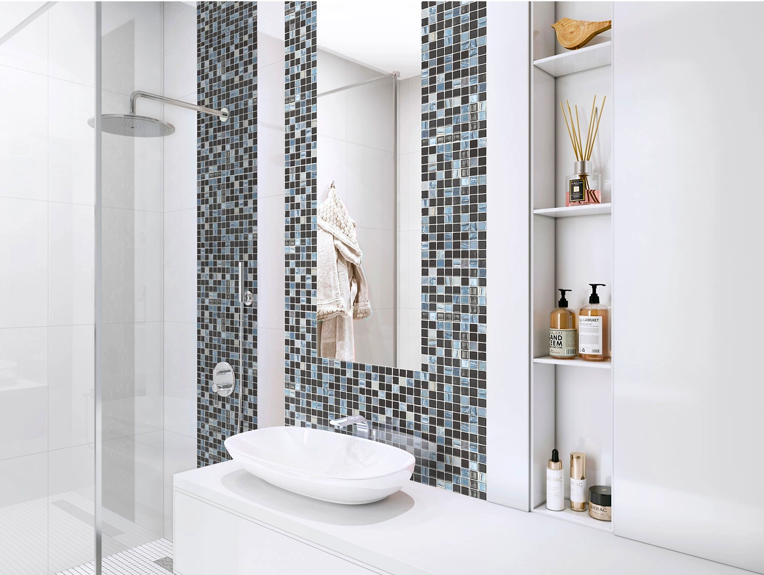 Стеклянная мозаика испанской фабрики Vidrepur Astro голубых оттенков подходит для облицовки любых сантехнических помещений, бассейнов и спа. Поверхность мозаики это микс гладких и объемных блестящих элементов, которые делают поверхность стен изящной и привлекательной.