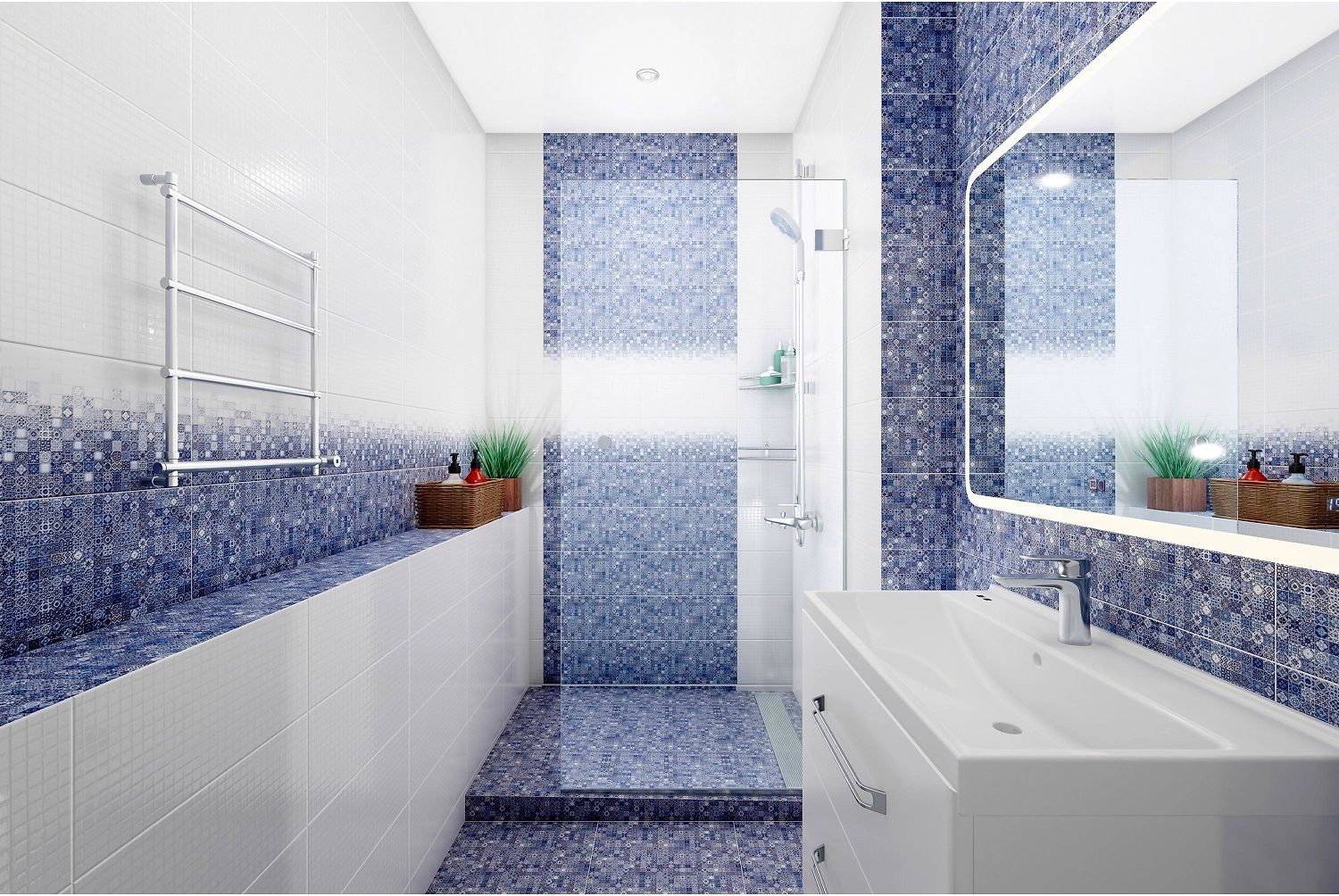 - Цвет и рисунок мозаики прекрасно маскируют мыльные разводы и другие загрязнения.