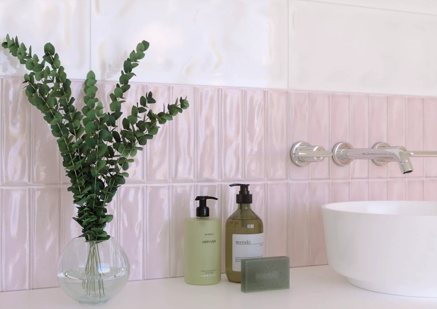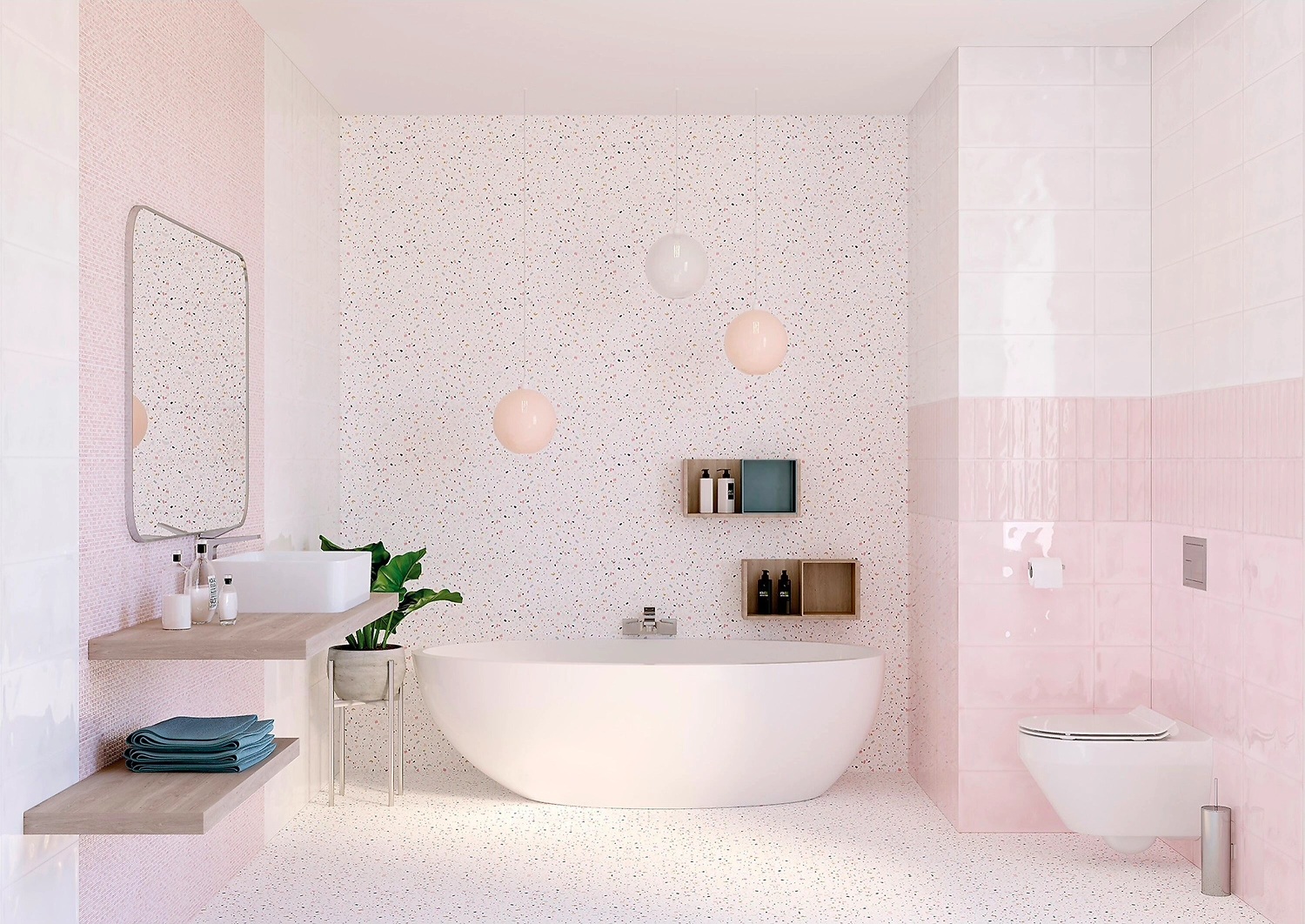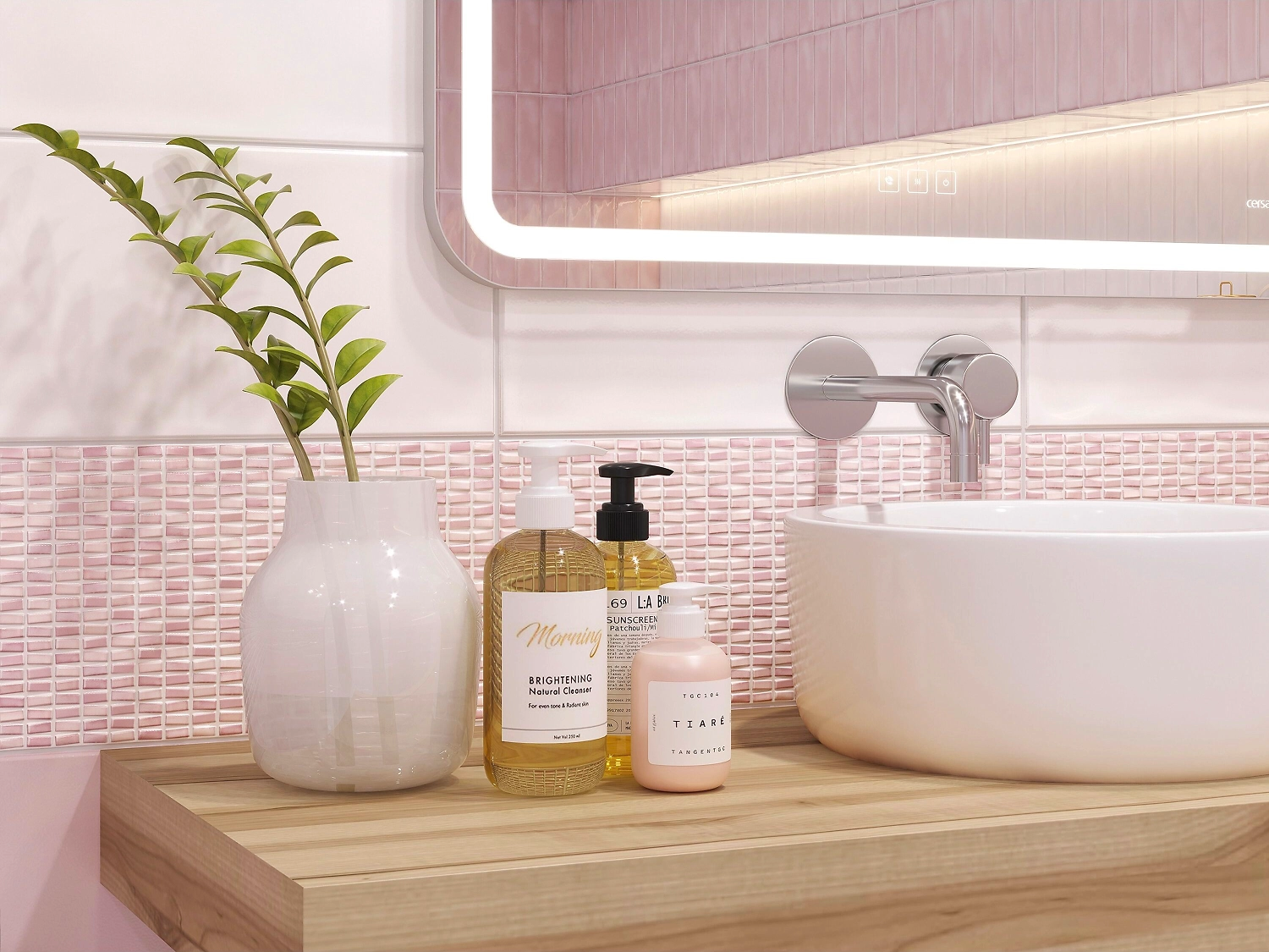 Создайте ультрасовременную уютную ванную комнату в стиле софт-минимализм. Однотонная плитка выглядит лаконично и элегантно, пудровые оттенки делают атмосферу теплой и комфортной.