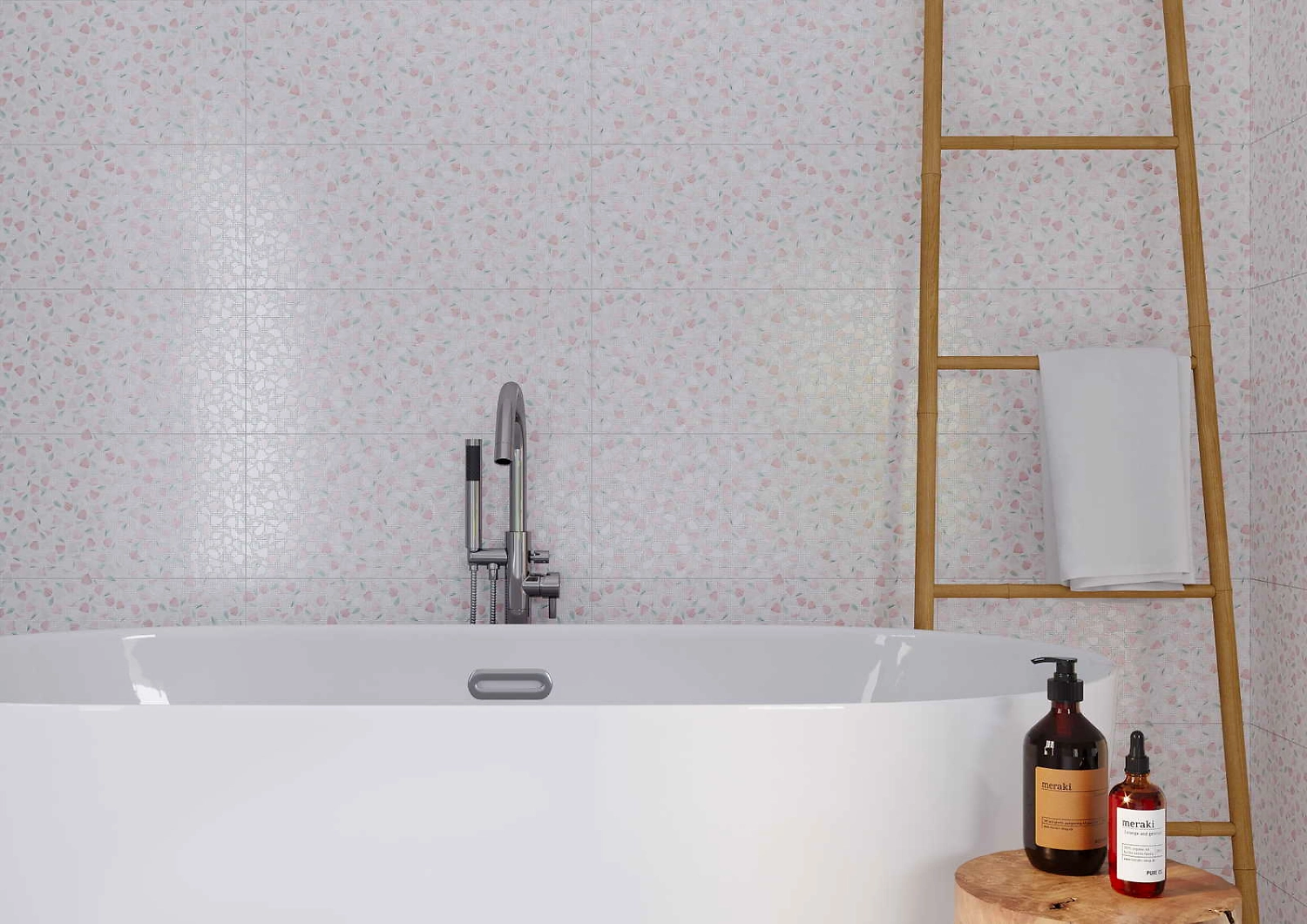 Больше свежести! Базовые цвета коллекции Sweety turquoise – классический белый, мятный и нежно-розовый – словно возвращают миру очарование юности. Особый шарм придает декоративная вставка в технике терраццо, где роль привычных вкраплений выполняют цветочные лепестки, а крафтовый рельеф глянцевой поверхности, имитирующая hand made, создает своеобразную игру света и тени. Среди элементов коллекции – плиты, напоминающие мелкую мозаику, которая воспроизводит интересный 3D-эффект – отличная идея как для интерьеров современных квартир, так и для баров и кафе!