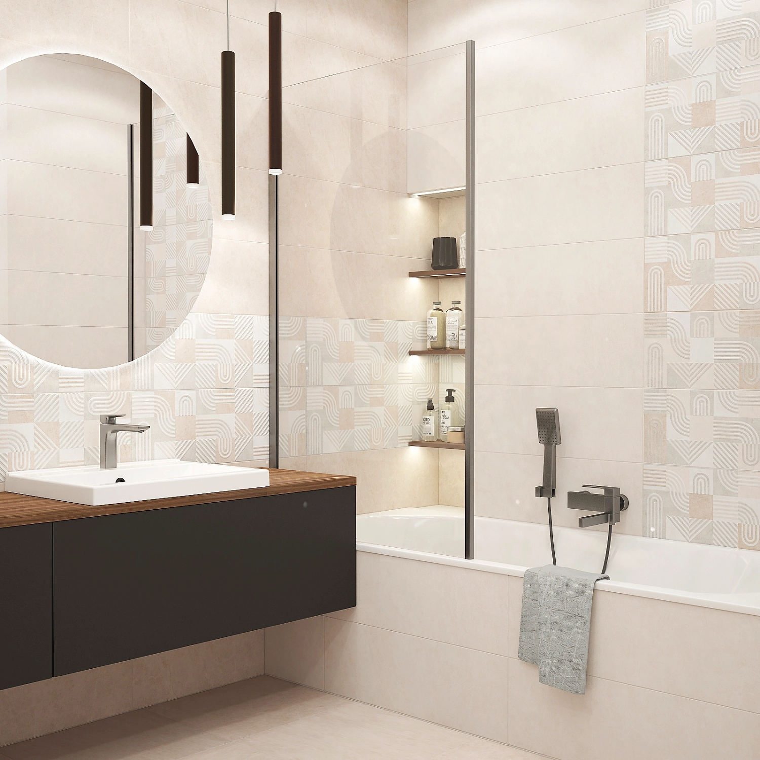 Фактура базовой плитки создана в стиле дизайна интерьеров роскошных арт-галерей Сохо. А два вида декоров: с оригинальными геометрическими мотивами и разнонаправленной шпаклёвкой, погружают вас в такую разную и манящую атмосферу мощеных улиц, элегантных зданий, кофеен и бутиков знаменитого Сохо.