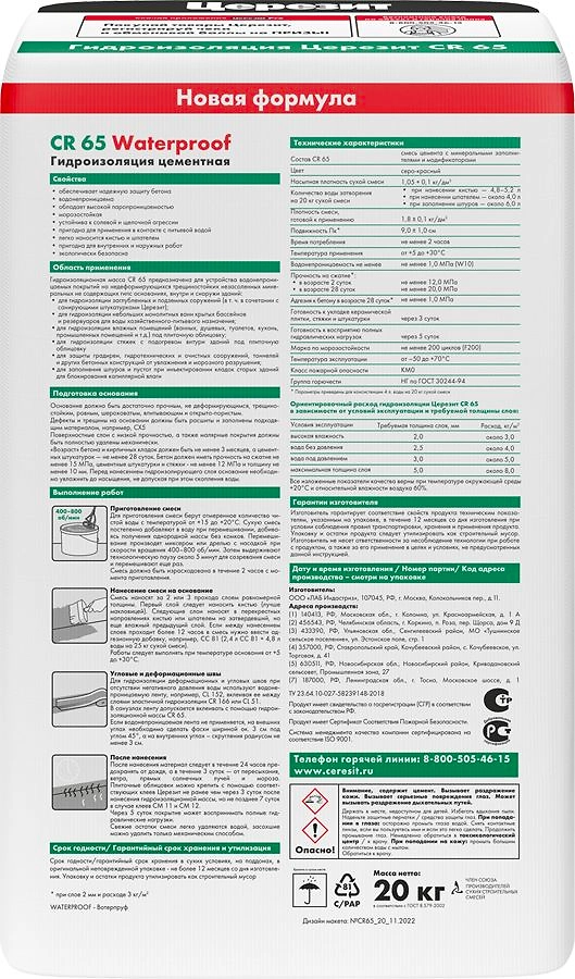 Церезит CR 65 WATERPROOF - обмазочная цементная гидроизоляция для создания водонепроницаемых покрытий на полах и стенах при проведении наружных и внутренних отделочных работ.