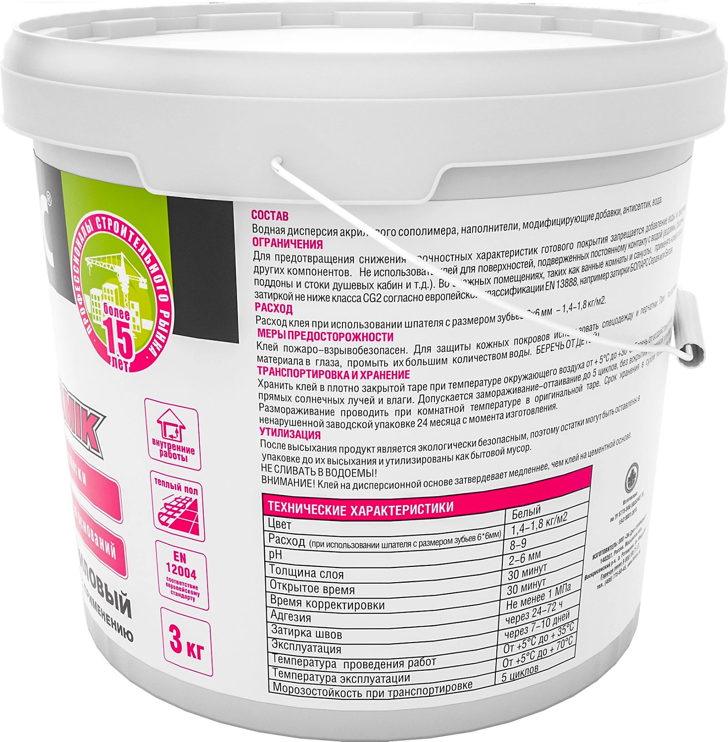 Плиточный клей акриловый БОЛАРС WALLFIX KERAMIK предназначен для приклеивания стеклянной и терракотовой мозаики, керамической плитки с водопоглощением более 3% размером не более 250х250 мм на стены и 300х300 мм на пол. Может применяться по сложным основаниям, таким как фанера и OSB-плиты в системах «теплый пол». Обладает высокой клеящей способностью, легко наносится. Экологически безопасен, может применяться без ограничений во всех типах жилых и общественных помещений.