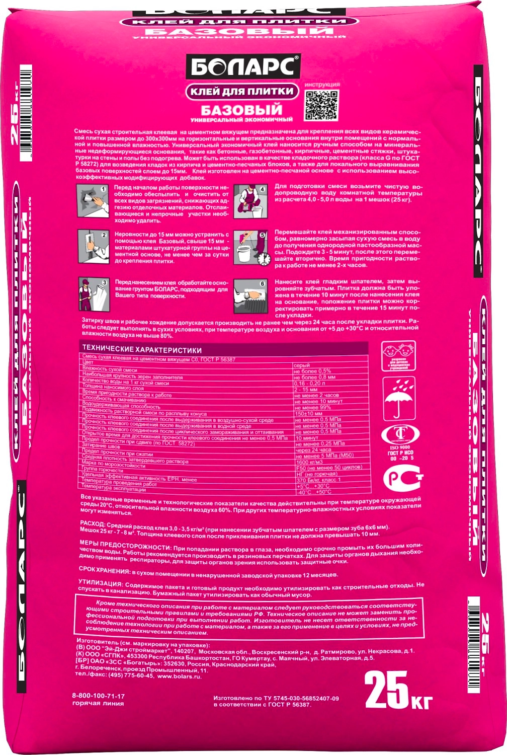 Клей для плитки Боларс Базовый. Универсальный экономичный клей для крепления всех видов керамической плитки размером до 300х300 мм на горизонтальные и вертикальные основания в помещениях с нормальной и повышенной влажностью. Удерживаемый вес плитки: до 20 кг/м² поверхности. Клей может быть использован в качестве кладочного раствора (класса G по ГОСТ Р 58272) для возведения кладок из кирпича и цементно-песчаных блоков, а также для локального выравнивания базовых поверхностей слоем до 15 мм. Наносится ручным способом.
