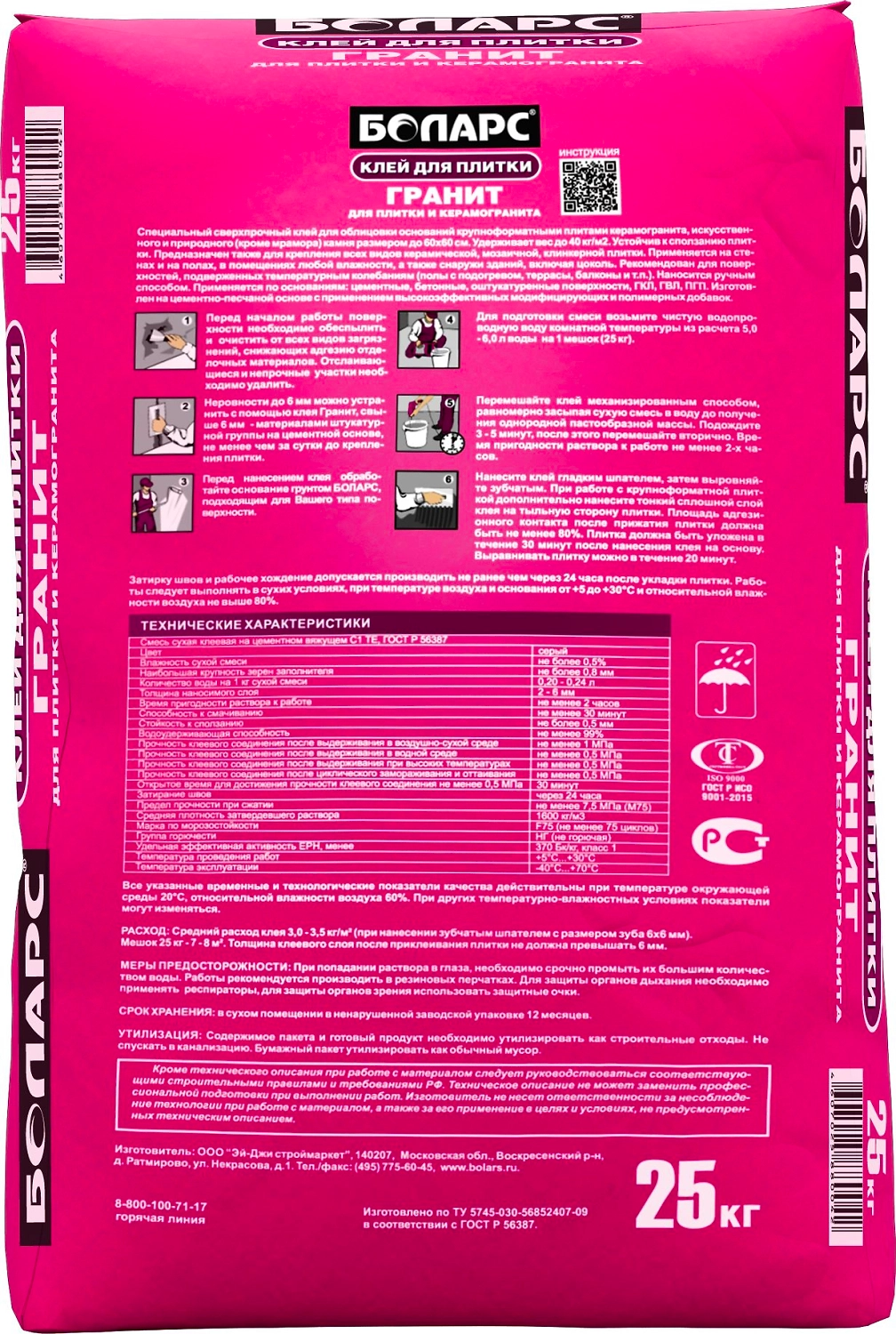 Клей для плитки Боларс Гранит. Специальный сверхпрочный клей для облицовки оснований тяжелыми крупноформатными плитами керамогранита, искусственного и природного (кроме мрамора) камня размером до 600х600 мм (пол и стены). Удерживаемый вес плитки: до 40 кг/м поверхности. Устойчив к сползанию плитки. Предназначен также для крепления всех видов керамической, мозаичной, клинкерной плитки. Применяется на стенах и на полах, в помещениях любой влажности, а также снаружи зданий, включая цоколь. Рекомендован для поверхностей, подверженных температурным колебаниям (полы с подогревом, террасы, балконы и т.п.). Наносится ручным способом.
