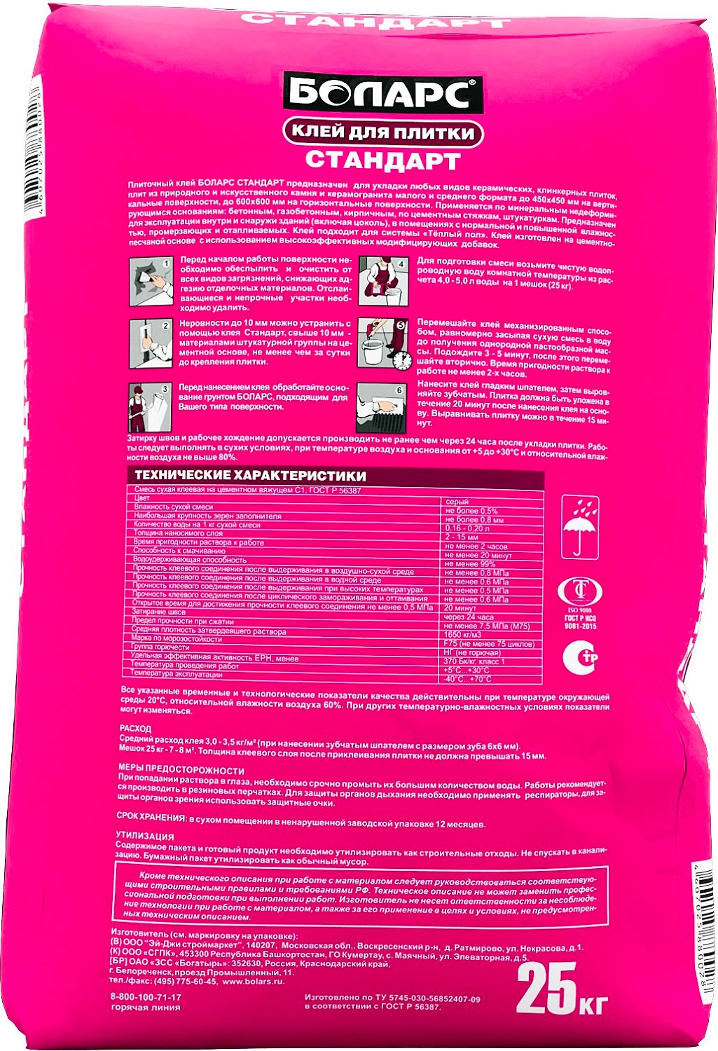 Клей для плитки Боларс Стандарт. Усиленный клей класса С1 для укладки любых видов керамических, клинкерных плиток, плит из природного и искусственного камня и керамогранита. Рекомендуемый размер плитки: до 450х450 мм (стены), до 600х600 мм (пол). Удерживаемый вес плитки: до 25 кг/м² поверхности. Клей предназначен для эксплуатации внутри и снаружи зданий (включая цоколь), а также в помещениях с нормальной и повышенной влажностью, промерзающих и отапливаемых. Клей подходит для системы «Тёплый пол». Наносится ручным способом.
