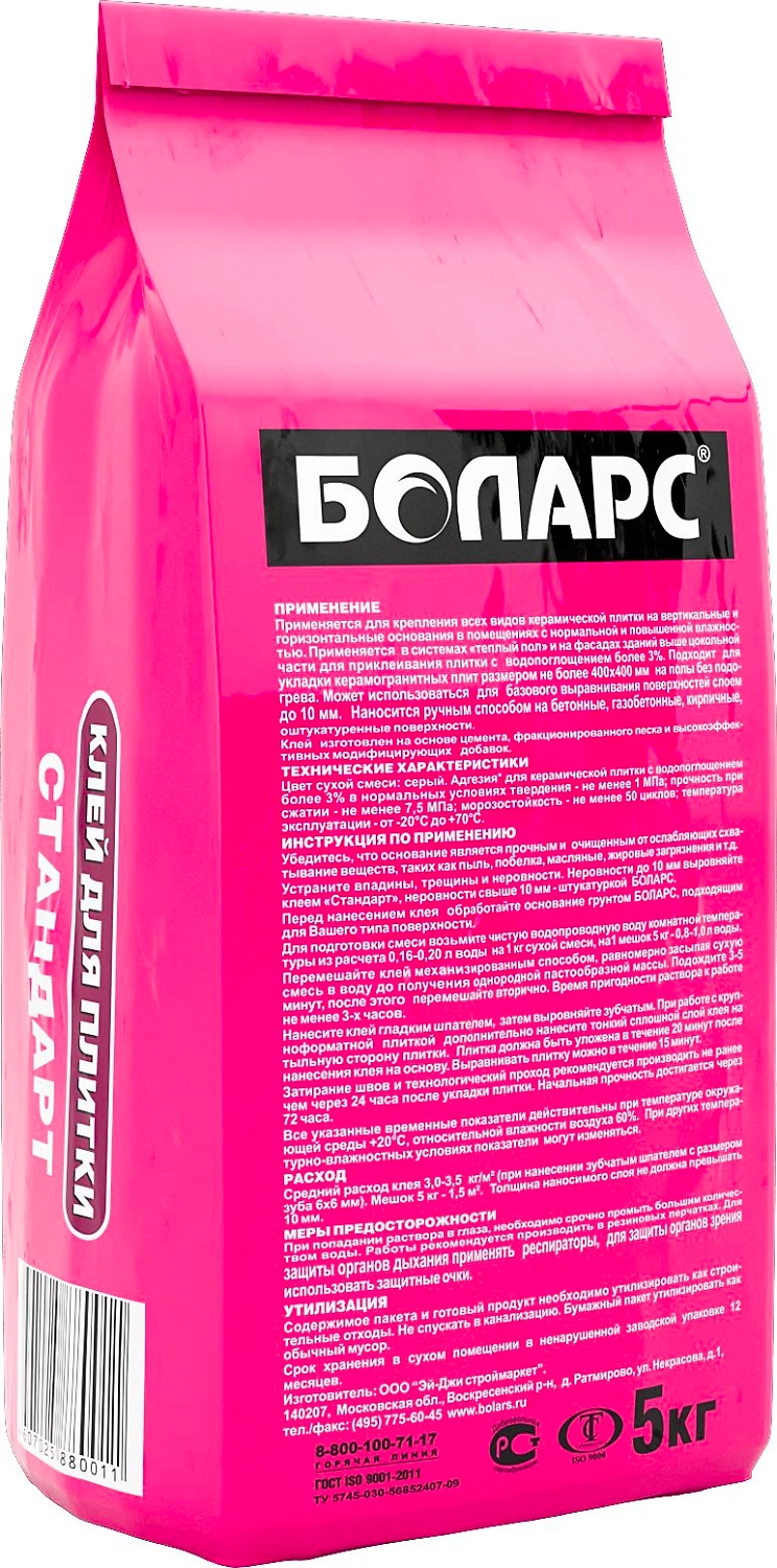 Клей для плитки Боларс Стандарт. Усиленный клей класса С1 для укладки любых видов керамических, клинкерных плиток, плит из природного и искусственного камня и керамогранита. Рекомендуемый размер плитки: до 450х450 мм (стены), до 600х600 мм (пол). Удерживаемый вес плитки: до 25 кг/м² поверхности. Клей предназначен для эксплуатации внутри и снаружи зданий (включая цоколь), а также в помещениях с нормальной и повышенной влажностью, промерзающих и отапливаемых. Клей подходит для системы «Тёплый пол». Наносится ручным способом.